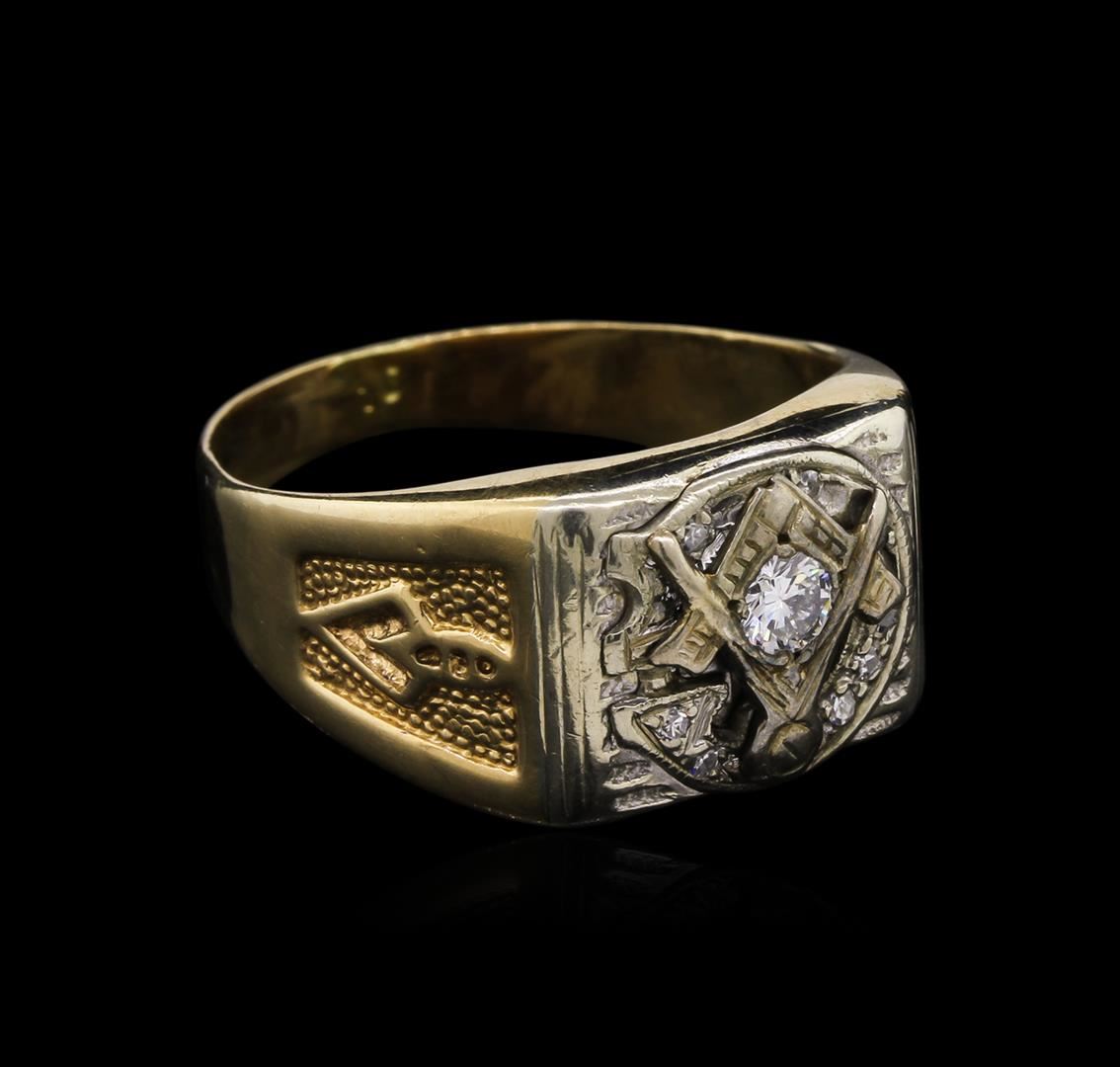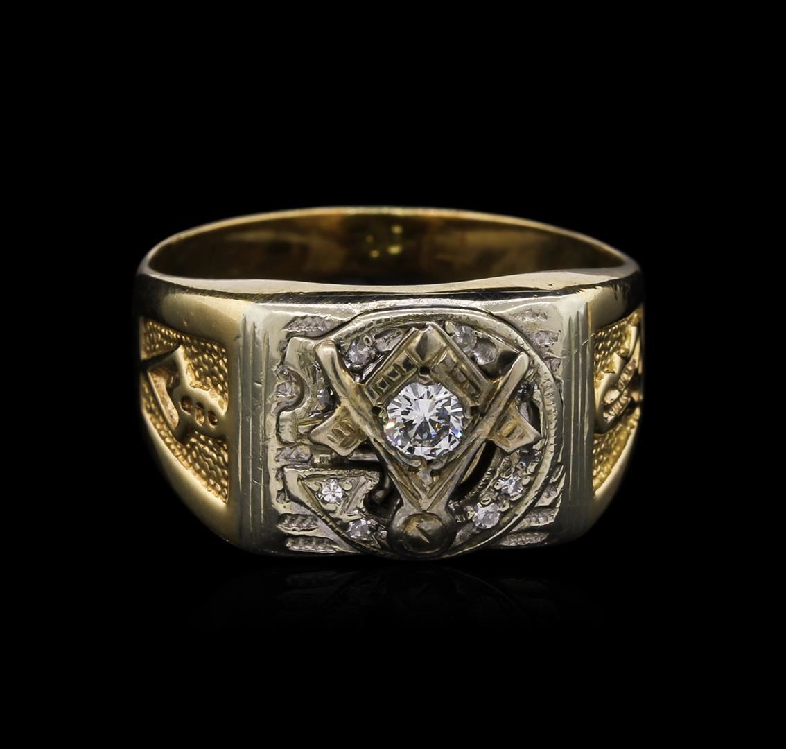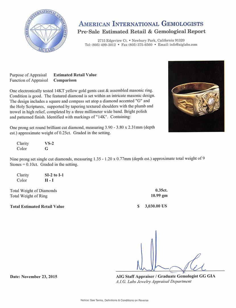 One electronically tested 14KT yellow gold gents cast & assembled masonic ring. The featured diamond is set within an intricate masonic design. The design includes a square and compass set atop a diamond accented "G" and the Holy Scriptures, supported by tapering textured shoulders with the plumb and trowel in high relief, completed by a three millimeter wide band. Bright polish and patterned finish. Identified with markings of "14K". Condition is good. Containing: One prong set round brilliant cut diamond, measuring 3.90 - 3.80 x 2.31mm (depth est.) approximate weight of 0.25ct. Graded in the setting. Clarity: VS-2. Color: G Nine prong set single cut diamonds, measuring 1.35 - 1.20 x 0.77mm (depth est.) approximate total weight of 9 Stones = 0.10ct. Graded in the setting. Clarity: SI-2 to I-1. Color: H - I. Total Weight of Diamonds 0.35ct. Total Weight of Ring 10.99gm. AIG Appraised at $3,030.00.