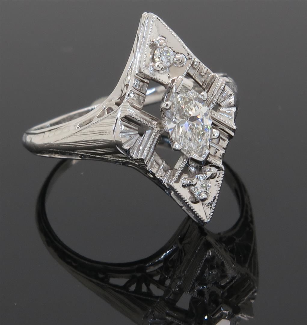 One tested 18K white gold vintage diamond ring. Containing: One Marquise Cut Diamond, Two Round Brilliant Cut Diamonds. Clarity: I-SI, Color: G-H. Approximate total diamond weight: .35CTW. Diamonds are graded in the mounting, unless otherwise stated. Weight of ring: 3.3 grams. Size: 6.5.