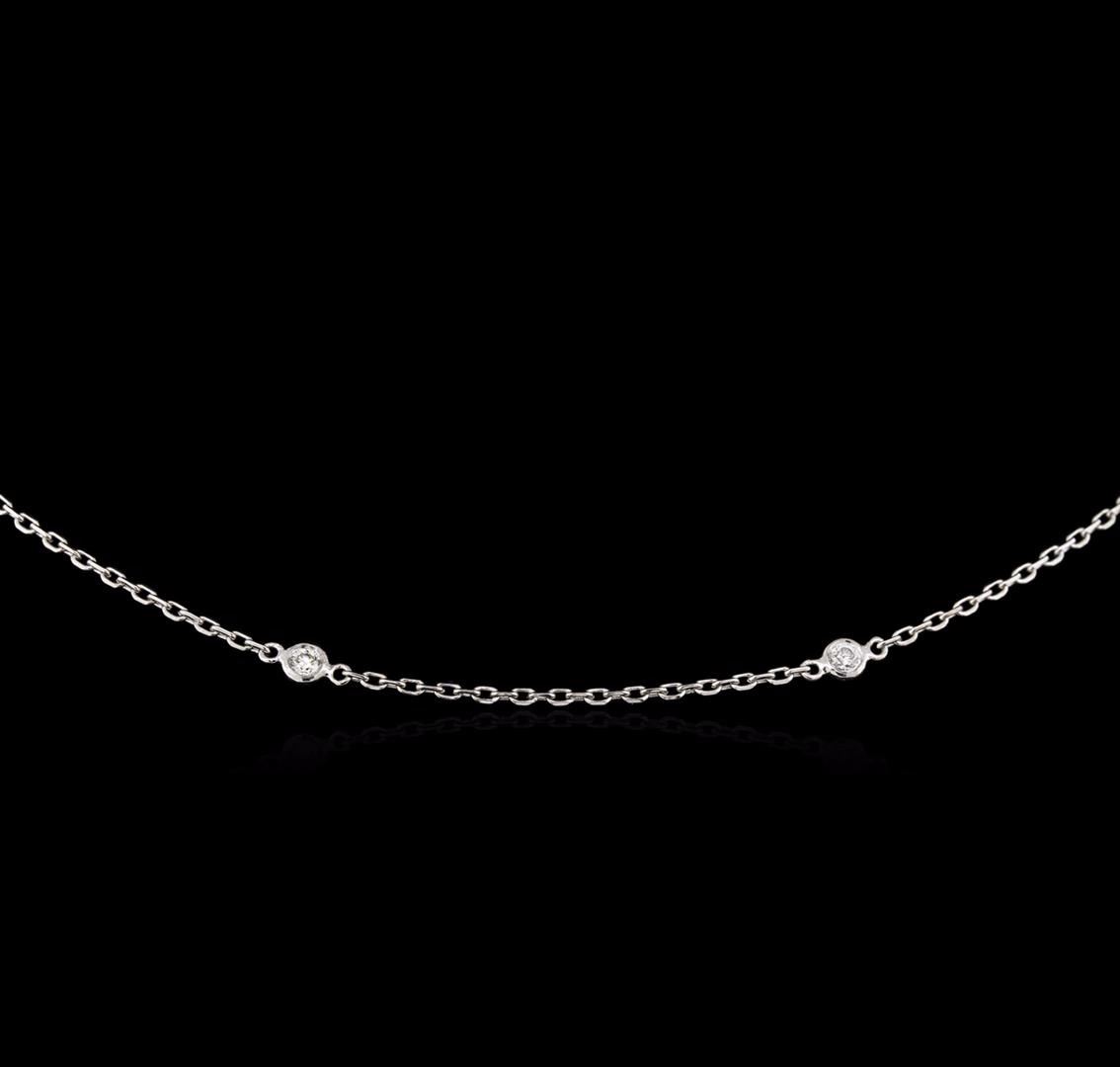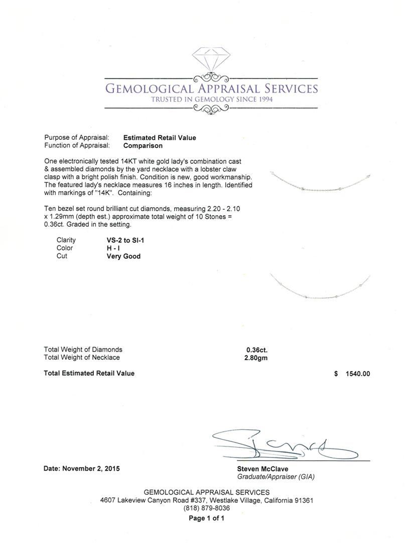 One electronically tested 14KT white gold lady's combination cast & assembled diamonds by the yard necklace with a lobster claw clasp with a bright polish finish. The featured lady's necklace measures 16 inches in length. Identified with markings of "14K". Condition is new, good workmanship. Containing: Ten bezel set round brilliant cut diamonds, measuring 2.20 - 2.10 x 1.29mm (depth est.) approximate total weight of 10 Stones = 0.36ct. Graded in the setting. Clarity: VS-2 to SI-1. Color: H - I. Cut Very Good. Total Weight of Diamonds 0.36ct. Total Weight of Necklace 2.80gm. GAS Appraised at $1,540.00.