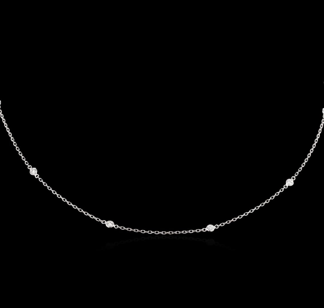 One electronically tested 14KT white gold lady's combination cast & assembled diamonds by the yard necklace with a lobster claw clasp with a bright polish finish. The featured lady's necklace measures 16 inches in length. Identified with markings of "14K". Condition is new, good workmanship. Containing: Ten bezel set round brilliant cut diamonds, measuring 2.20 - 2.10 x 1.29mm (depth est.) approximate total weight of 10 Stones = 0.36ct. Graded in the setting. Clarity: VS-2 to SI-1. Color: H - I. Cut Very Good. Total Weight of Diamonds 0.36ct. Total Weight of Necklace 2.80gm. GAS Appraised at $1,540.00.