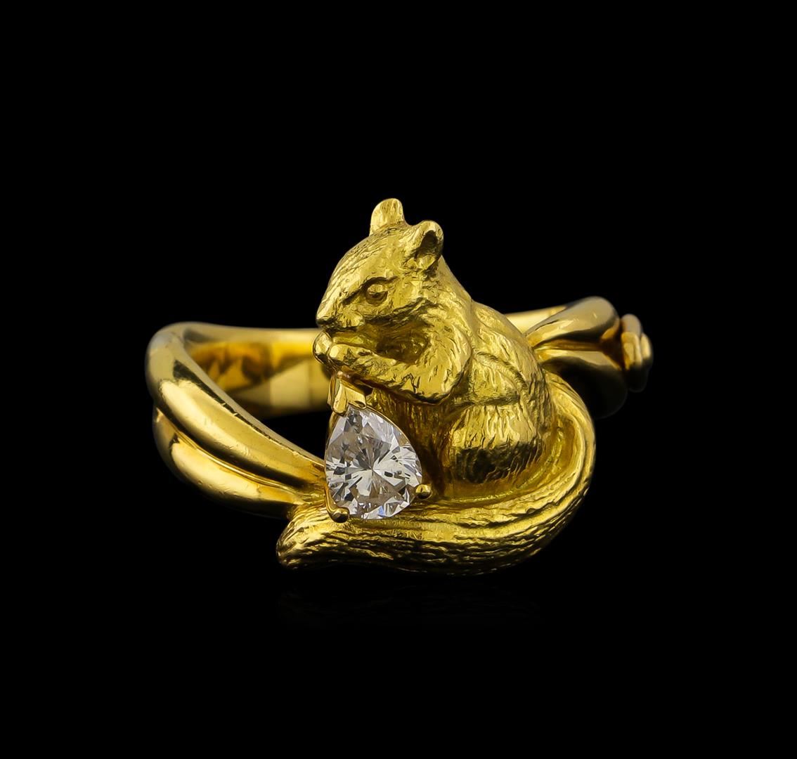 One electronically tested 18KT yellow gold lady's combination cast & assembled fashion ring with a bright polish finish. The featured lady's ring has a motif of a squirrel eating a nut and has a hinged shank with foldover figure eight safety that measures 3.75 millimeters wide. Identified with markings of "18K". Condition is used, good workmanship. Containing: One prong set pear shaped cut diamond, measuring 5.70 x 4.10 x 2.58mm (depth est.) approximate weight of 0.36ct. Graded in the setting. Clarity: SI-2. Color: Good. Total Weight of Diamonds 0.36ct. Total Weight of Ring 12.70gm. GAS Appraised at $3,495.00.