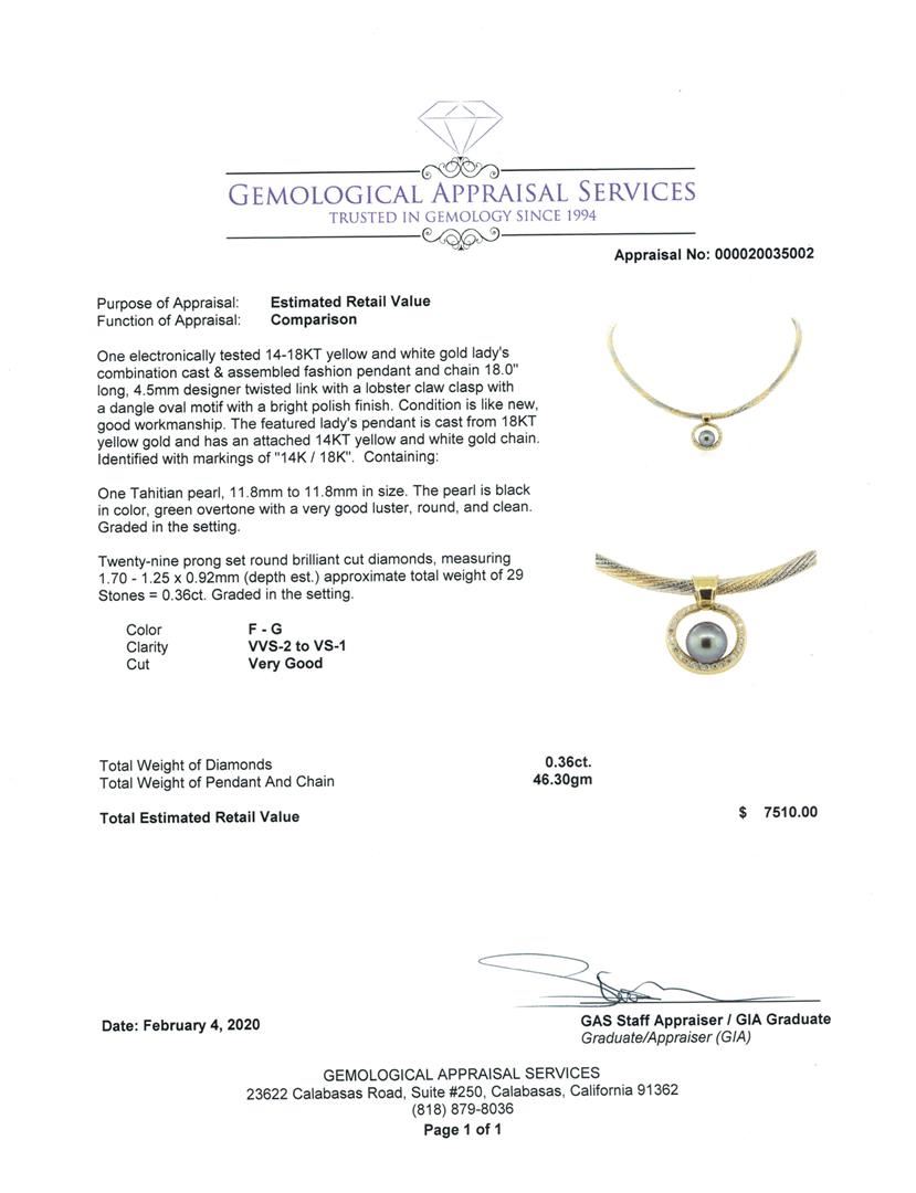 One electronically tested 14-18KT yellow and white gold lady's combination cast & assembled fashion pendant and chain 18.0' long, 4.5mm designer twisted link with a lobster claw clasp with a dangle oval motif with a bright polish finish. The featured lady's pendant is cast from 18KT yellow gold and has an attached 14KT yellow and white gold chain. Identified with markings of '14K / 18K'. Condition is like new, good workmanship. Containing: One Tahitian pearl, 11.8mm to 11.8mm in size. The pearl is black in color, green overtone with a very good luster, round, and clean. Graded in the setting. Twenty-Nine prong set round brilliant cut diamonds, measuring 1.70 - 1.25 x 0.92mm (depth est.) approximate total weight of 29 Stones = 0.36ct. Graded in the setting. Color F - G Clarity VVS-2 to VS-1 Cut Very Good. Total Weight of Diamonds 0.36ct.. Total Weight of Pendant And Chain 46.30gm GAS Appraised at $7510.00. GAS Appraised.