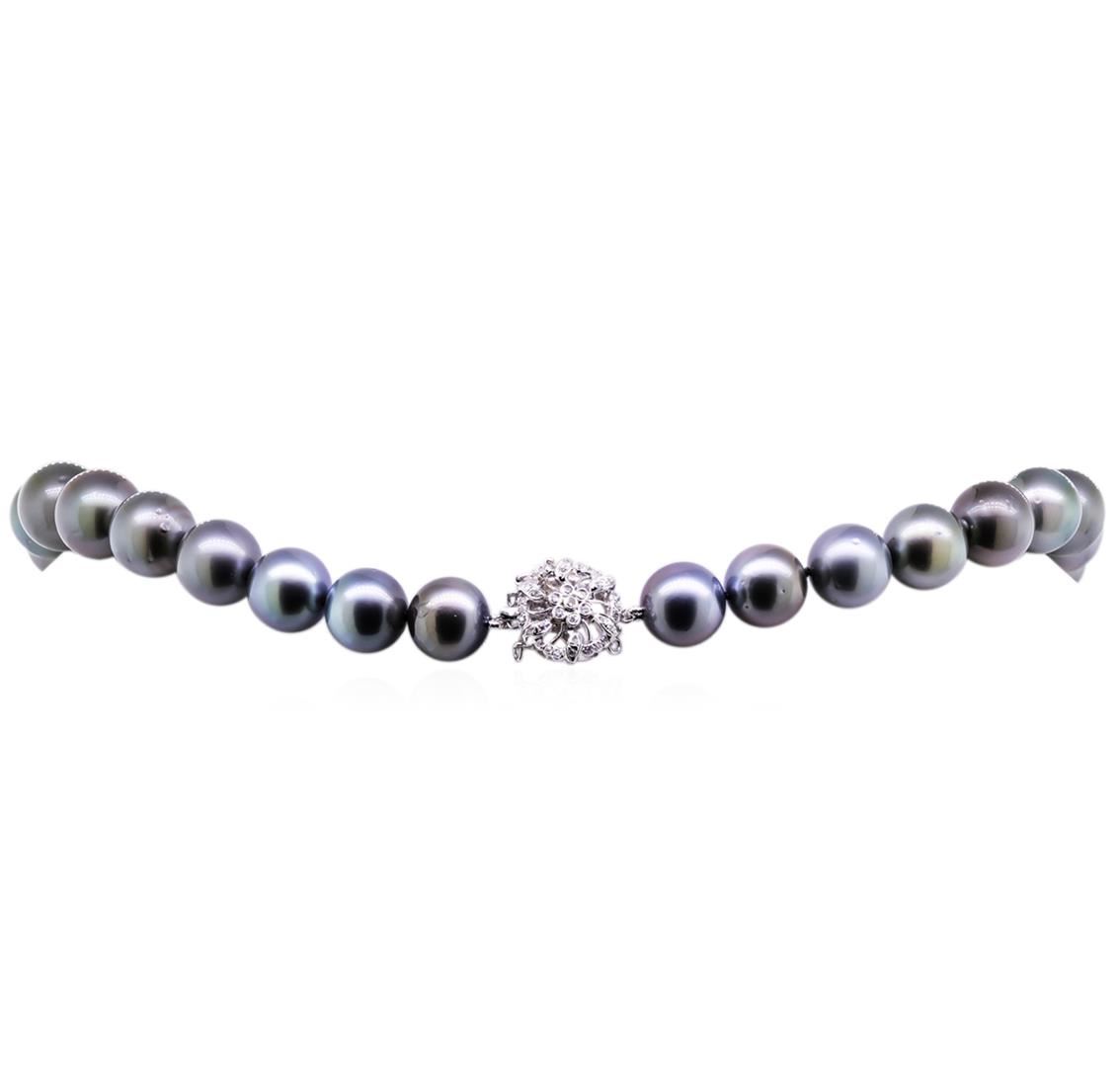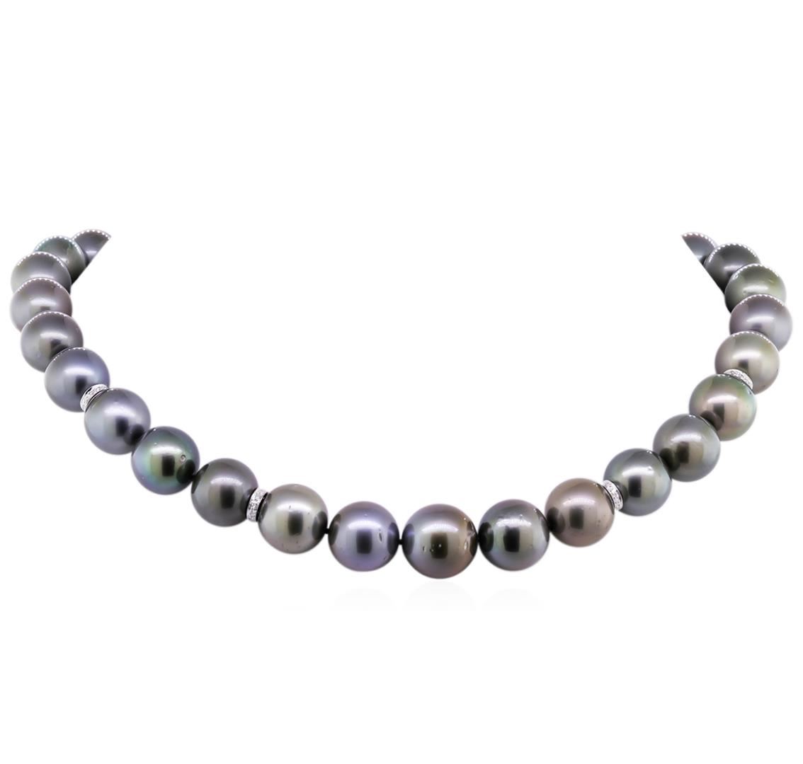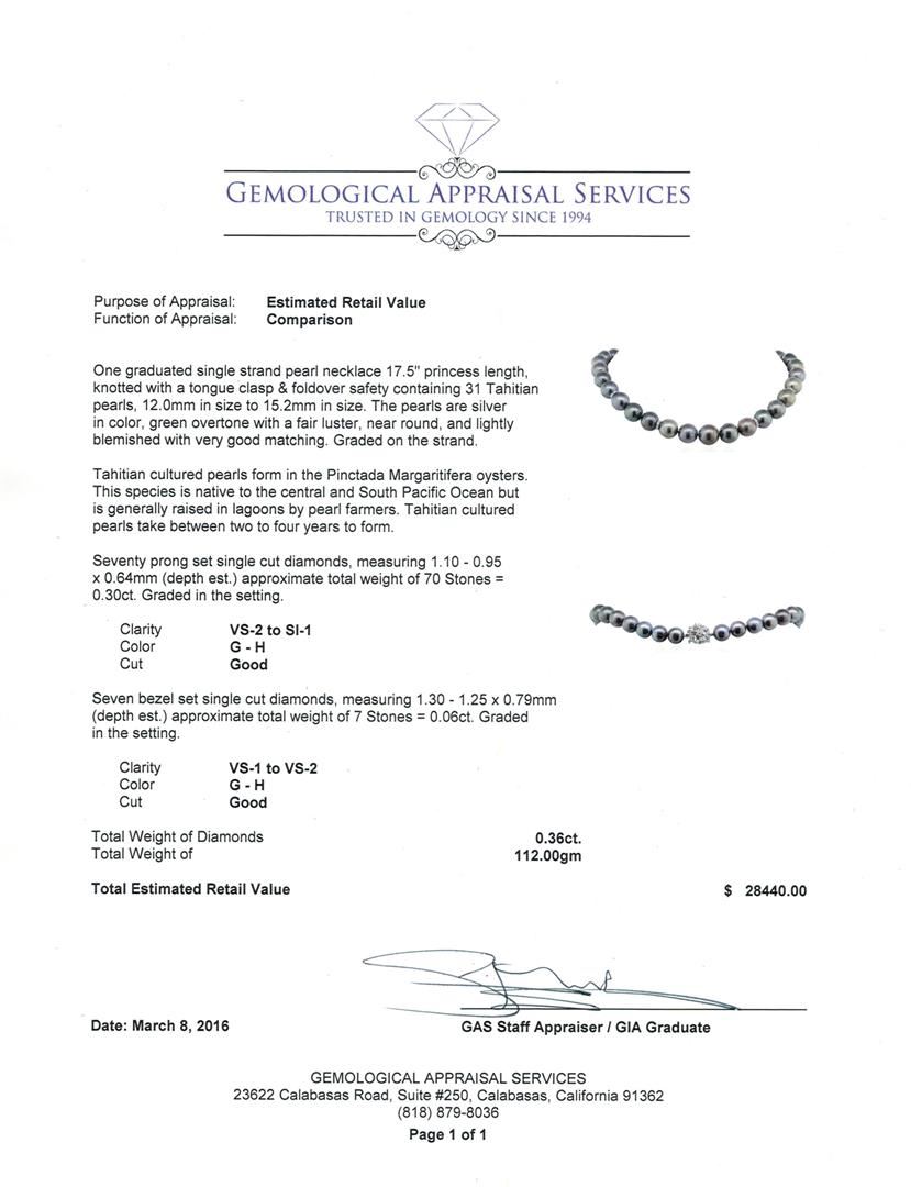 One graduated single strand pearl necklace 17.5" princess length, knotted with a tongue clasp & foldover safety containing 31 Tahitian pearls, 12.0mm in size to 15.2mm in size. The pearls are silver in color, green overtone with a fair luster, near round, and lightly blemished with very good matching. Graded on the strand. Tahitian cultured pearls form in the Pinctada Margaritifera oysters. This species is native to the central and South Pacific Ocean but is generally raised in lagoons by pearl farmers. Tahitian cultured pearls take between two to four years to form. Seventy prong set single cut diamonds, measuring 1.10 - 0.95 x 0.64mm (depth est.) approximate total weight of 70 Stones = 0.30ct. Graded in the setting. Clarity: VS-2 to SI-1. Color: G - Good Seven bezel set single cut diamonds, measuring 1.30 - 1.25 x 0.79mm (depth est.) approximate total weight of 7 Stones = 0.06ct. Graded in the setting. Clarity: VS-1 to VS-2. Color: G - Good. Total Weight of Diamonds 0.36ct. Total Weight of 112.00gm. GAS Appraised at $28,440.00.
