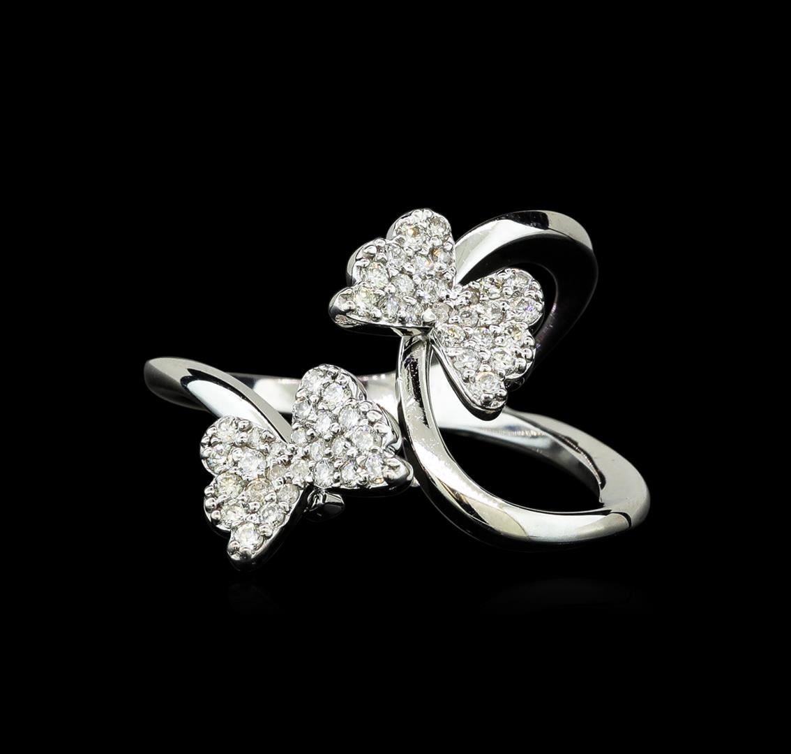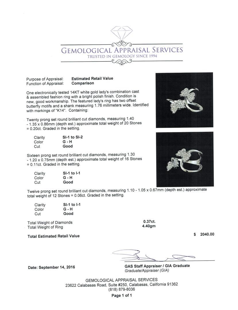 One electronically tested 14KT white gold lady's combination cast & assembled fashion ring with a bright polish finish. The featured lady's ring has two offset butterfly motifs and a shank measuring 1.76 millimeters wide. Identified with markings of 'K14'. Condition is new, good workmanship. Containing: Twenty prong set round brilliant cut diamonds, measuring 1.40 - 1.35 x 0.86mm (depth est.) approximate total weight of 20 Stones = 0.20ct. Graded in the setting. Clarity SI-1 to SI-2. Color: G - H Cut Good Sixteen prong set round brilliant cut diamonds, measuring 1.30 - 1.20 x 0.75mm (depth est.) approximate total weight of 16 Stones = 0.11ct. Graded in the setting. Clarity SI-1 to I-1. Color: G - H Cut Good Twelve prong set round brilliant cut diamonds, measuring 1.10 - 1.05 x 0.67mm (depth est.) approximate total weight of 12 Stones = 0.06ct. Graded in the setting. Clarity SI-1 to I-1. Color: G - H Cut Good. Total Weight of Diamonds 0.37ct.. Total Weight of Ring 4.40gm GAS Appraised at $2,040.00.
