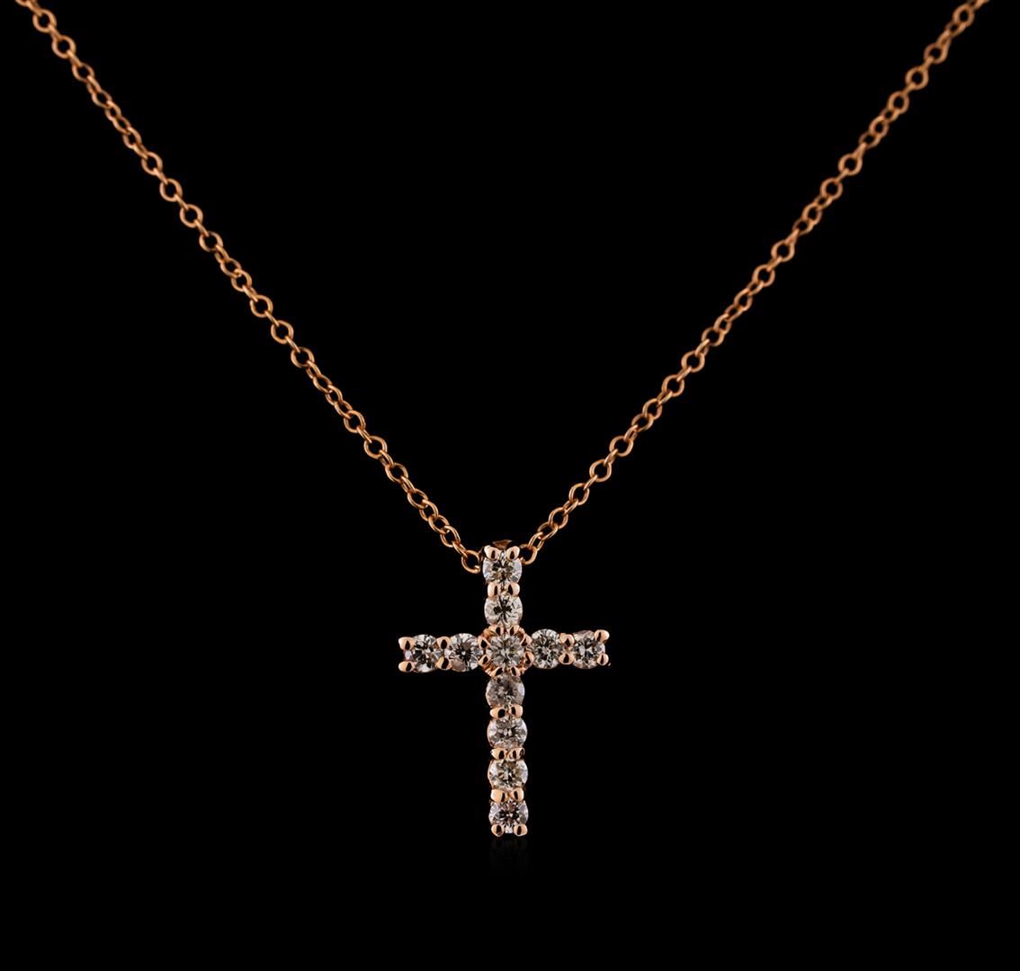 One cross pendant with chain featuring: 14KT rose gold weighing 2.09 grams containing diamonds weighing 0.39ctw.