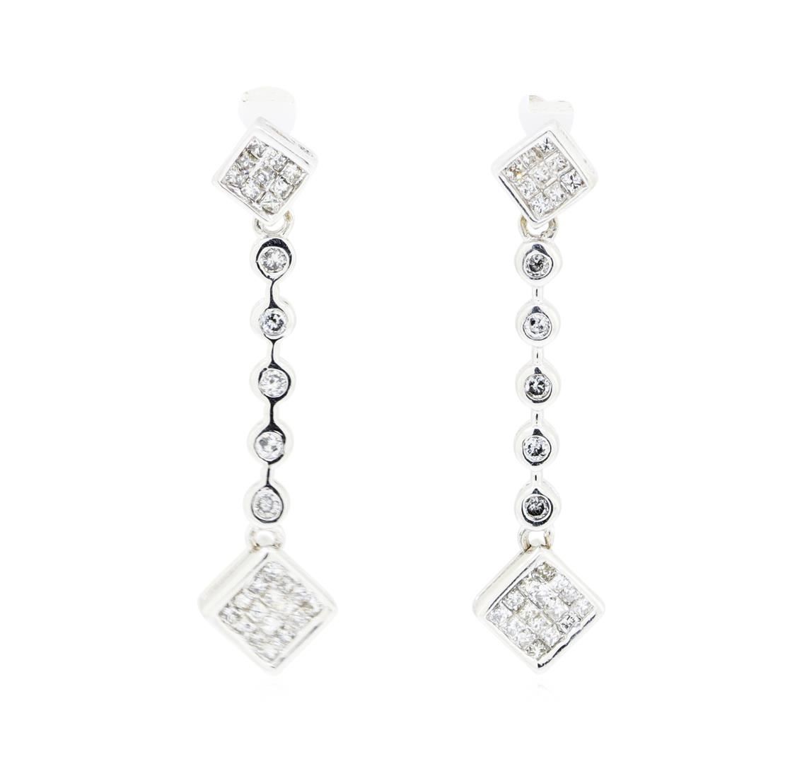 One pair of lady's diamond dangle earrings featuring: 14KT white gold weighing 2.6 grams containing diamonds weighing 0.40ctw.