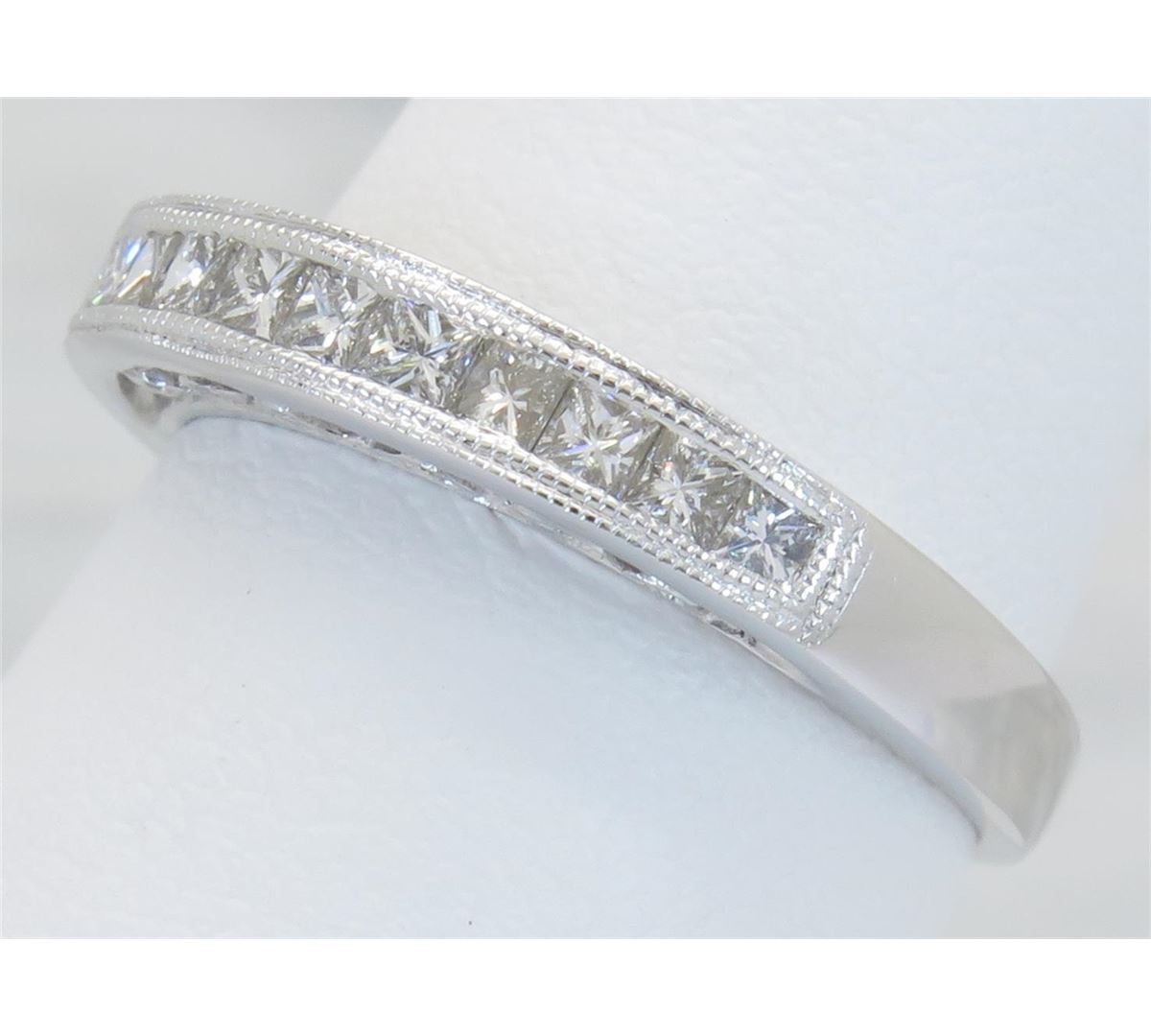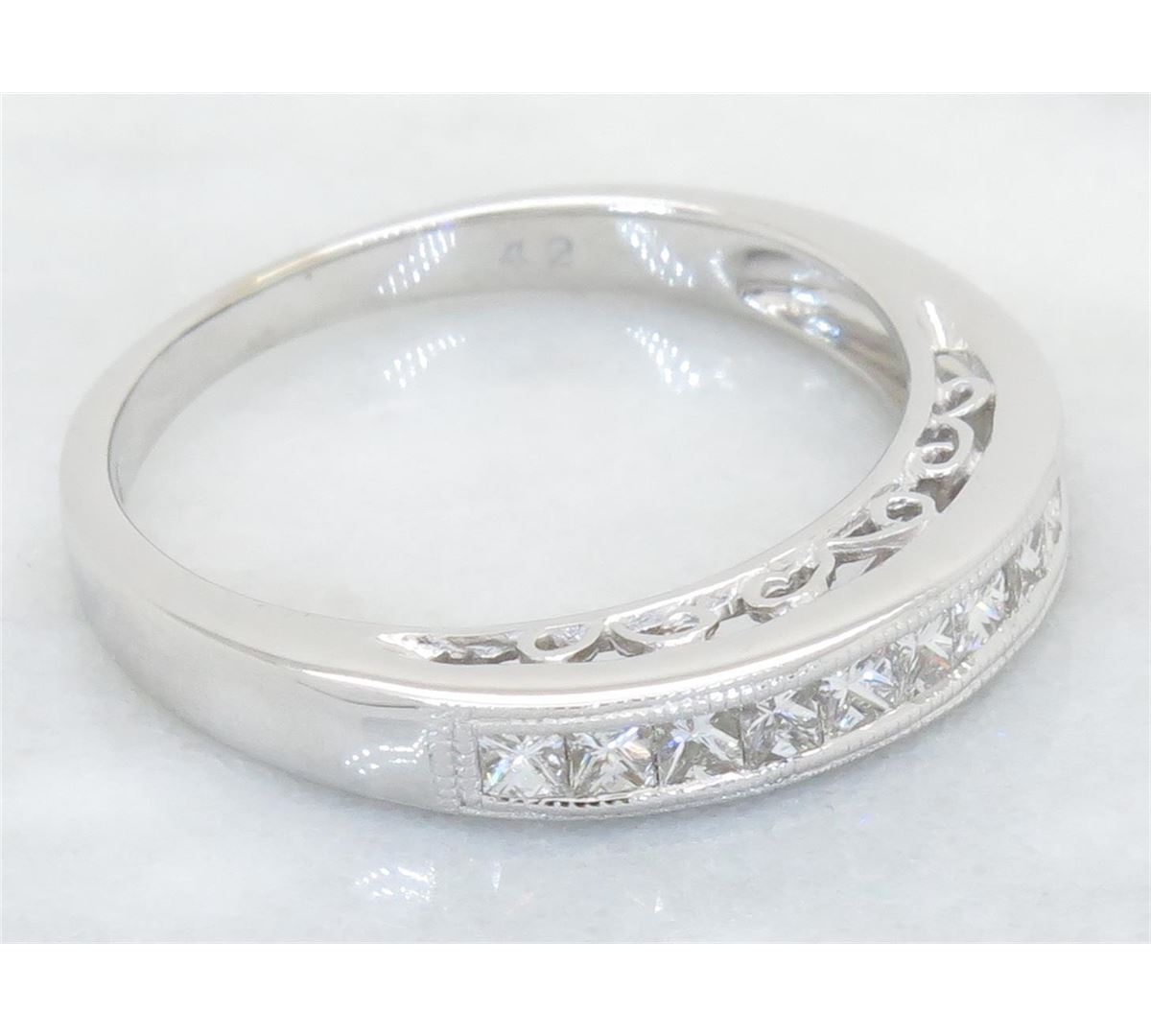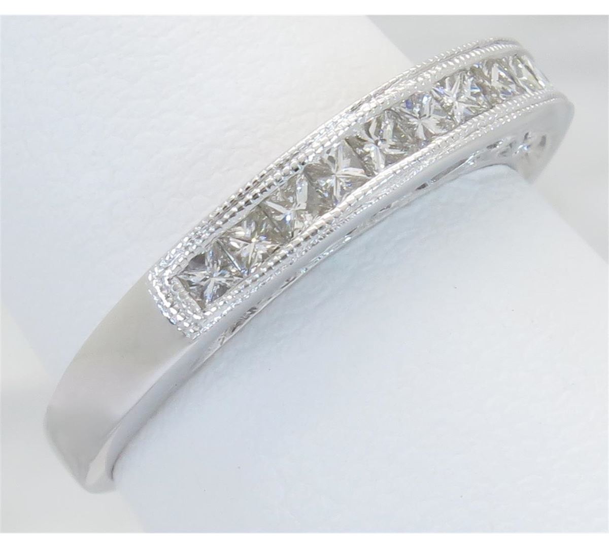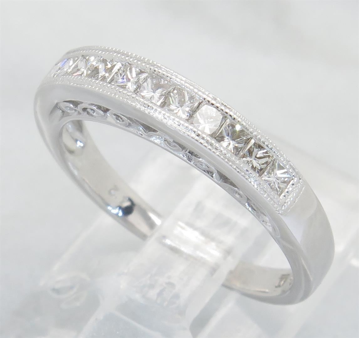 One tested 14K white gold diamond band. Containing: 11 Princess Cut Diamonds. Approximate total diamond weight: .40CTW. Diamonds are graded in the mounting, unless otherwise stated. Weight: 2.3 grams. Size: 5.0.
