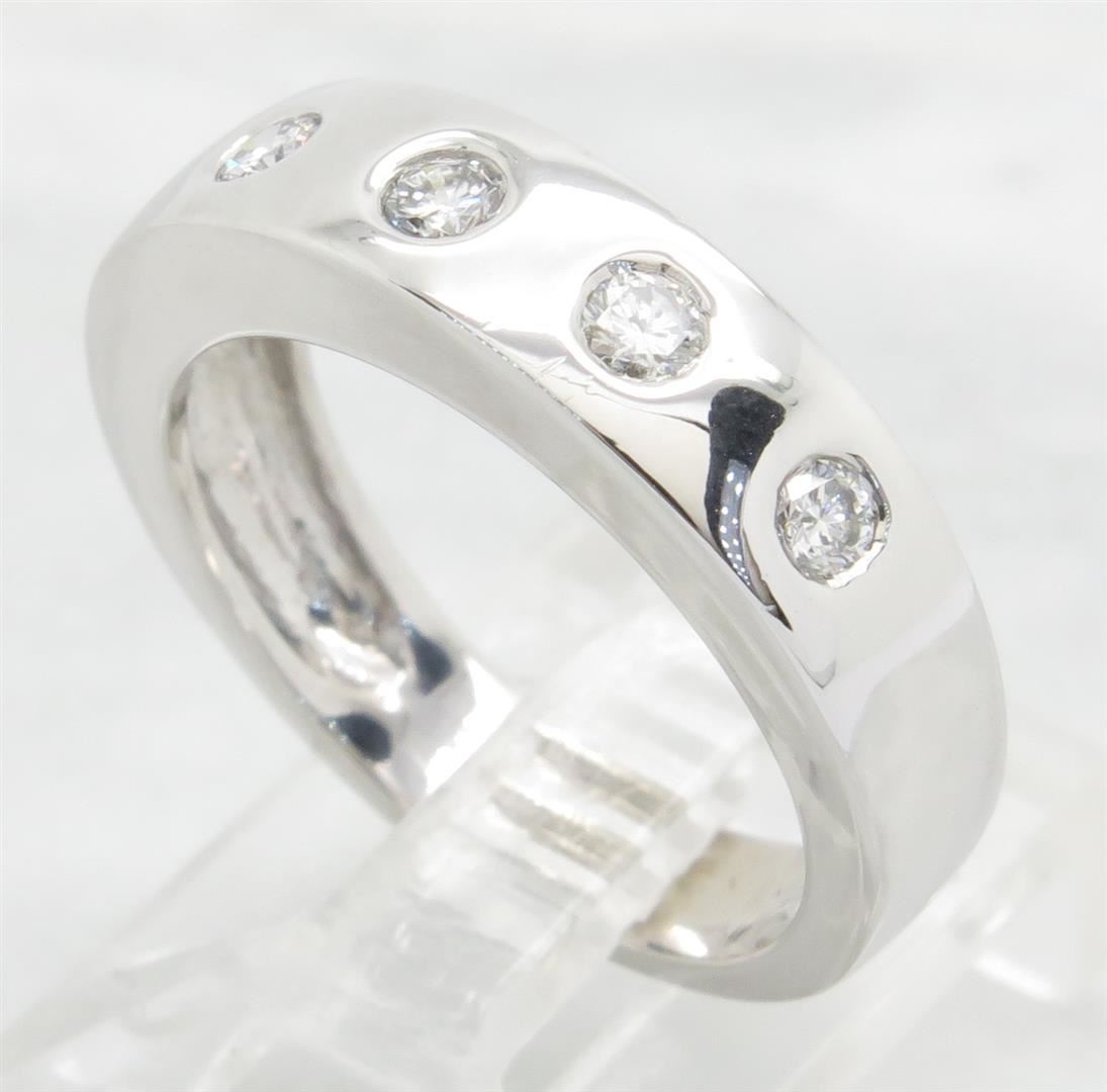 One tested 14K white gold diamond band. Condition is new. Containing: Five Round Brilliant Cut Diamonds. Clarity: I-SI, Color: G-H, Approximate total diamond weight: .40CTW. Diamonds are graded in the mounting, unless otherwise stated. Weight: 4.8 grams. Size: 5.25