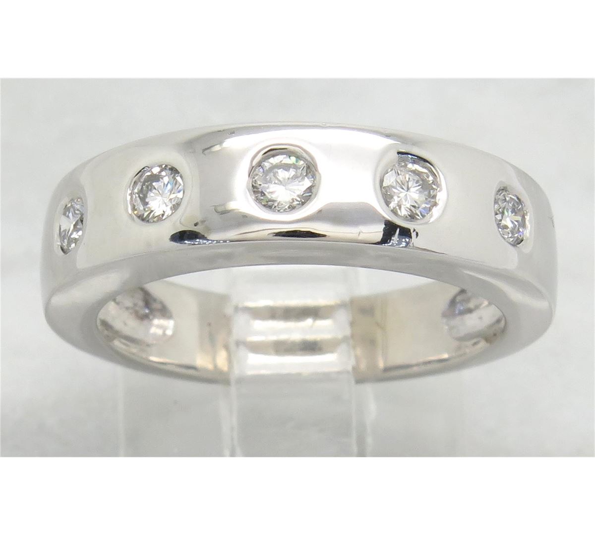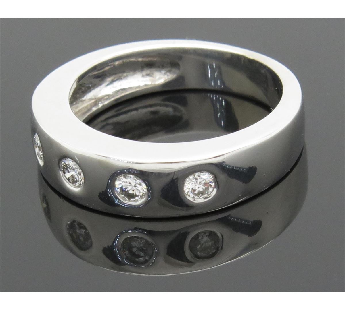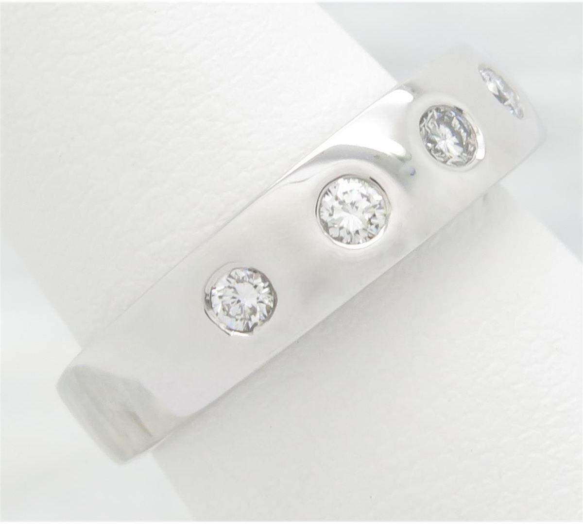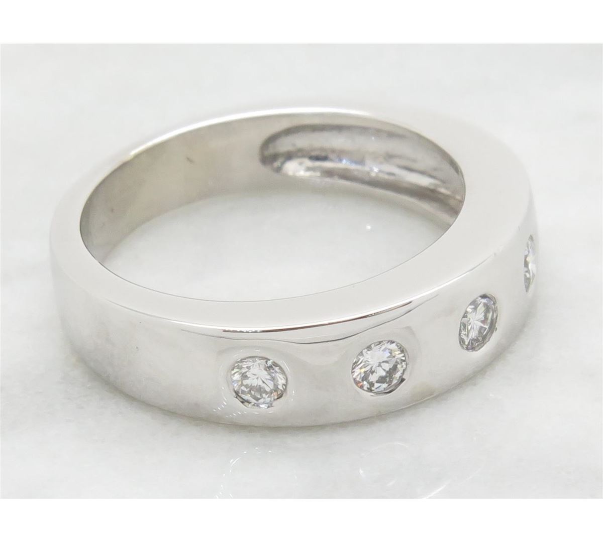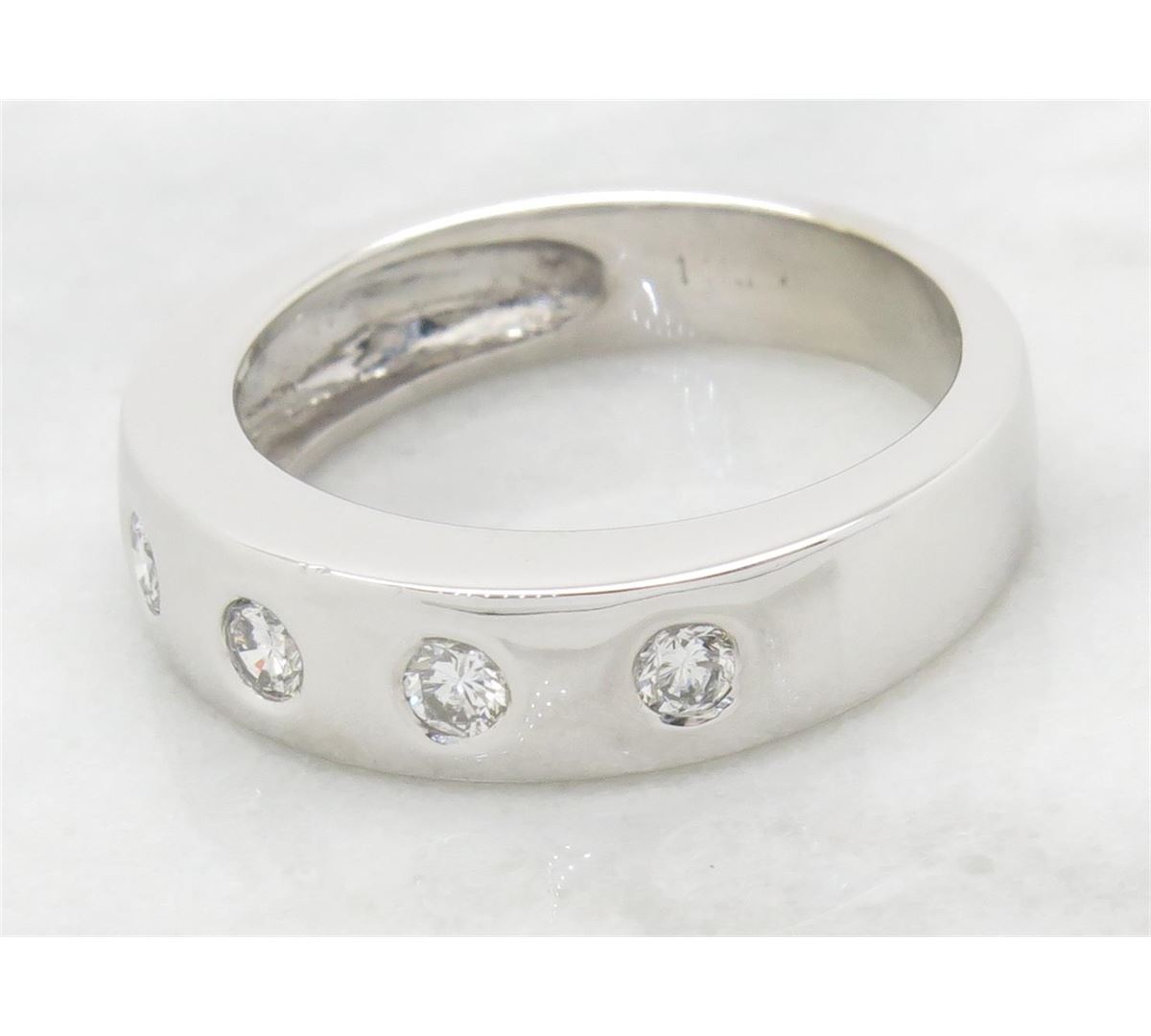 One tested 14K white gold diamond band. Condition is new. Containing: Five Round Brilliant Cut Diamonds. Clarity: I-SI, Color: G-H, Approximate total diamond weight: .40CTW. Diamonds are graded in the mounting, unless otherwise stated. Weight: 4.8 grams. Size: 5.25