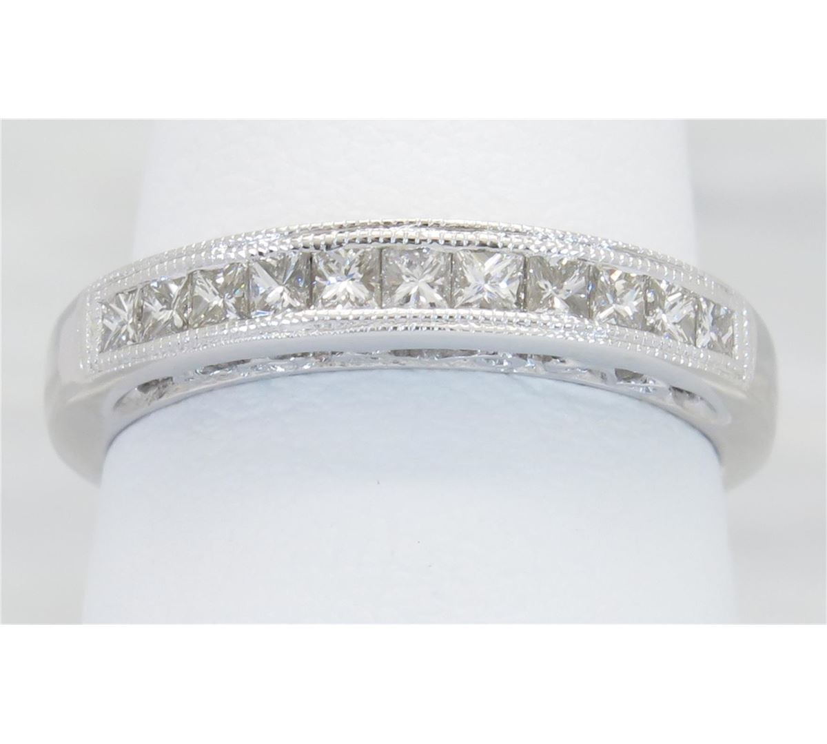 One tested 14K white gold diamond band. Containing: 11 Princess Cut Diamonds. Approximate total diamond weight: .40CTW. Diamonds are graded in the mounting, unless otherwise stated. Weight: 2.3 grams. Size: 5.0.