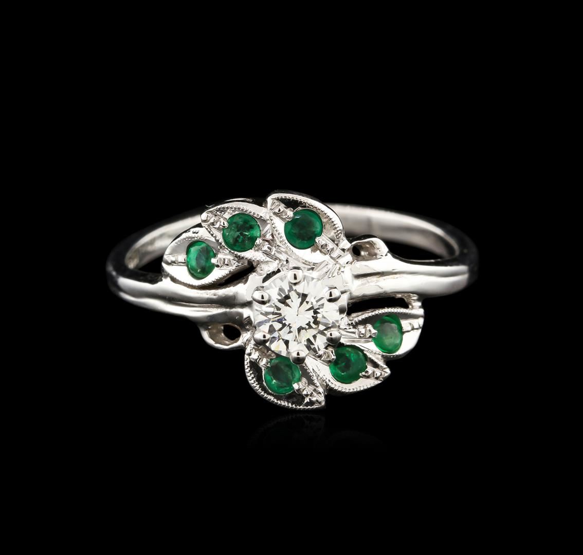 One ring featuring: 14KT white gold weighing 3.60 grams containing one diamond center stone with a total weight of 0.40ct and six emeralds with a total weight of 0.20ct.