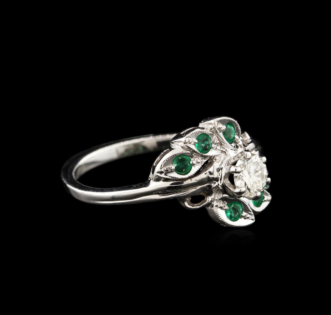 One ring featuring: 14KT white gold weighing 3.60 grams containing one diamond center stone with a total weight of 0.40ct and six emeralds with a total weight of 0.20ct.