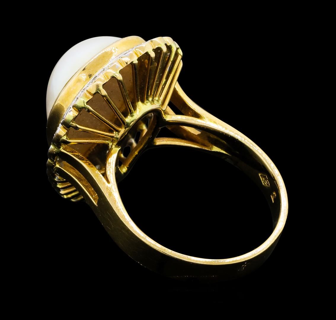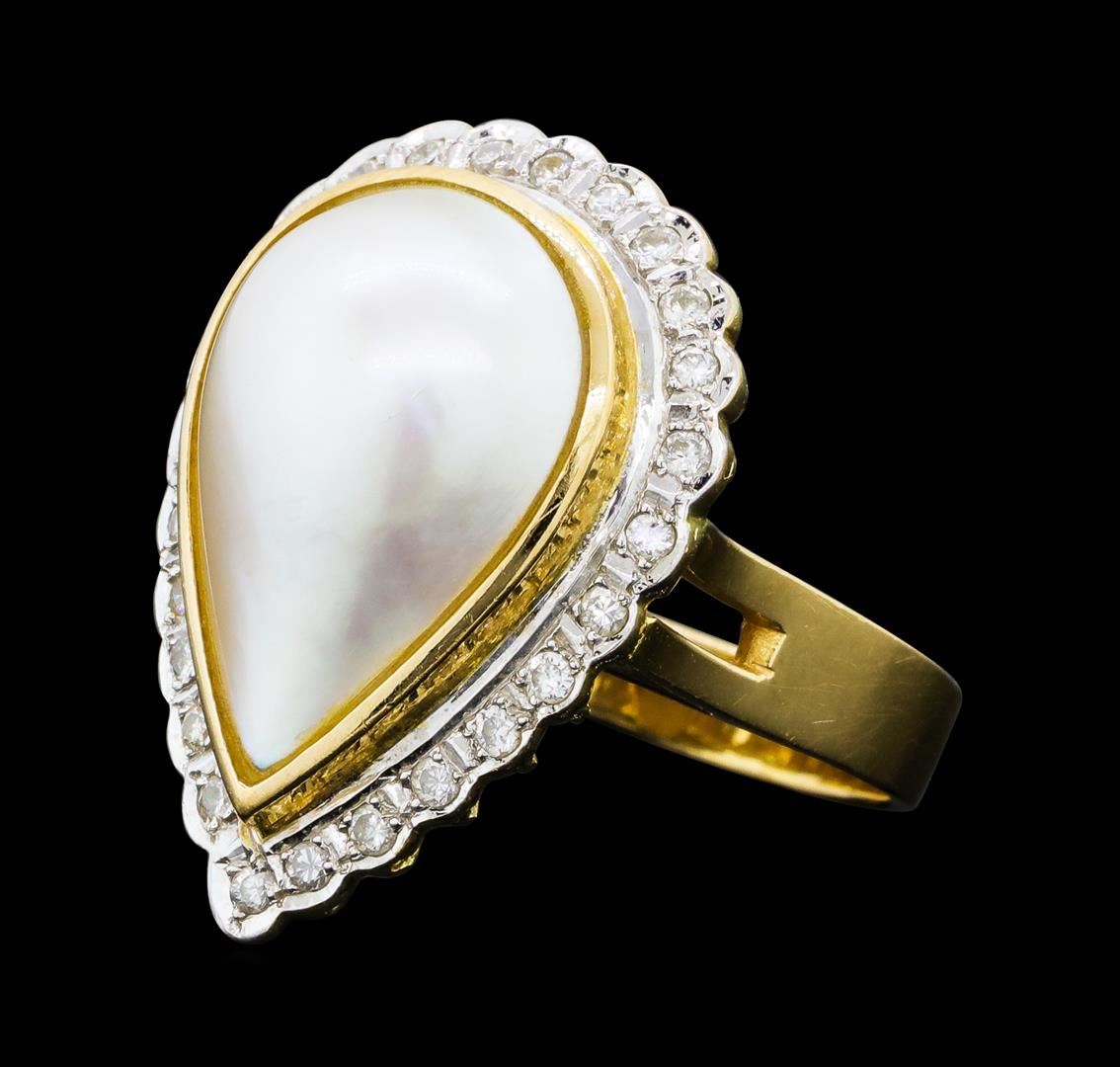 One lady's ring featuring: 14KT yellow gold weighing 8.3 grams containing one pear shaped mabe pearl and diamonds weighing 0.40ctw.