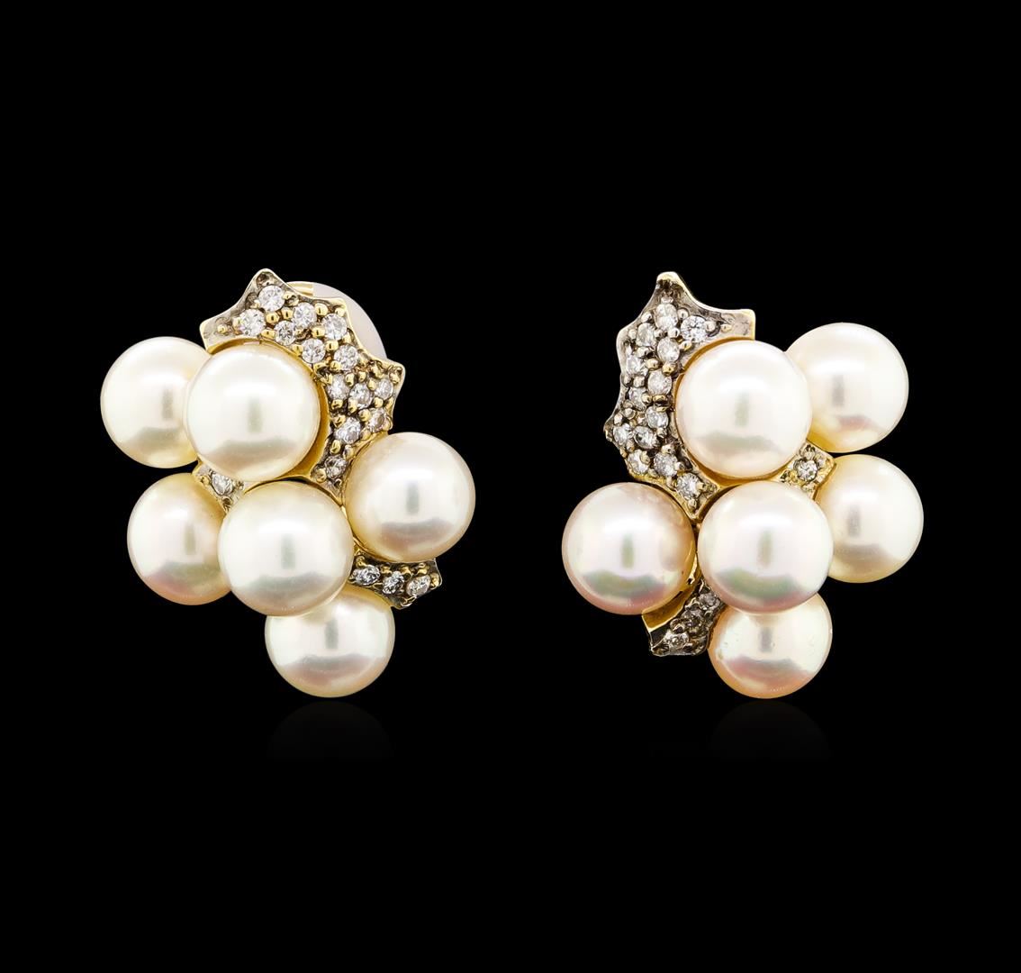 One pair electronically tested 14KT yellow gold lady's combination cast & assembled fashion earrings with Omega clip backs with posts with a bright polish finish. Identified with markings of '14K'. Condition is like new, good workmanship. Containing: Twelve akoya cultured pearls, 7.5mm to 7.2mm in size. The pearls are pink in color, ros� overtone with a very good luster, round, and clean with very good matching. Graded in the setting. Thirty-Four prong set round brilliant cut diamonds, measuring 1.50 - 1.40 x 0.90mm (depth est.) approximate total weight of 34 Stones = 0.40ct. Graded in the setting. Color H - I Clarity SI-1 to I-1 Cut Good. Total Weight of Diamonds 0.40ct.. Total Weight of Earrings 12.60gm GAS Appraised at $3020.00. GAS Appraised at $3,020.00.