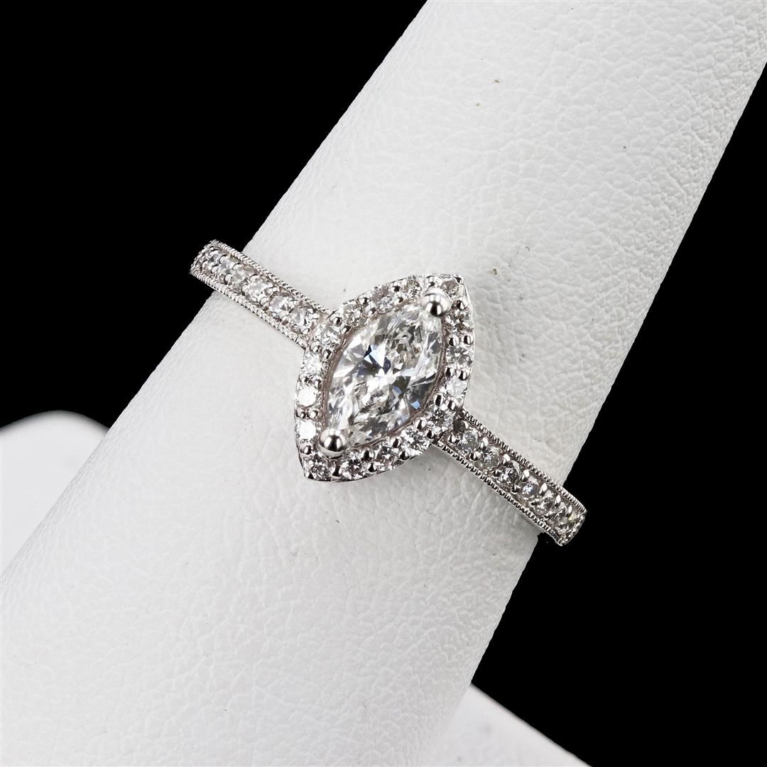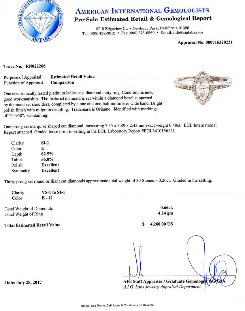 One electronically tested platinum ladies cast diamond unity ring. Condition is new, good workmanship. The featured diamond is set within a diamond bezel supported by diamond set shoulders, completed by a one and one-half millimeter wide band. Bright polish finish with milgrain detailing. Trademark is Orianne. Identified with markings of "PT950" One prong set marquise shaped cut diamond, measuring 7.35 x 3.89 x 2.43mm exact weight 0.40ct. EGL International Report attached. Graded loose prior to setting in the EGL Laboratory Report #EGL3410156121 Clarity SI-1 Color Depth 62.5% Table 56.0% Polish Excellent Symmetry Excellent Thirty prong set round brilliant cut diamonds approximate total weight of 30 Stones = 0.26ct. Graded in the setting Clarity VS-1 to SI-1 Color E - G Total Weight of Diamonds 0.66ct Total Weight of Ring 4.24 gm
