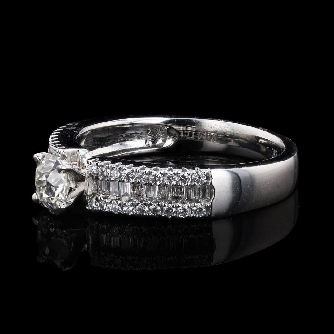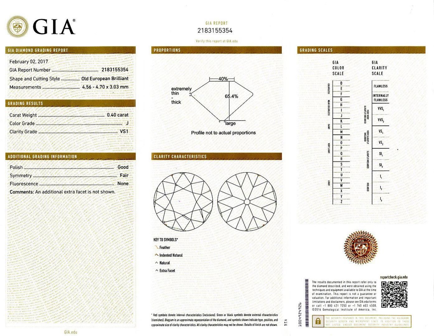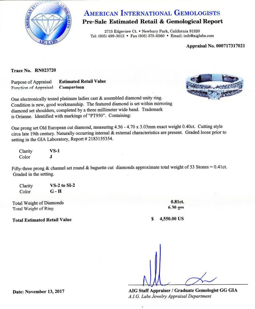One electronically tested platinum ladies cast & assembled diamond unity ring. Condition is new, good workmanship. The featured diamond is set within minoring diamond set shoulders, completed by a three millimeter wide band. Trademark is Orianne. Identified with markings of "PT950". Containing: One prong set Old European cut diamond, measuring 4.56 - 4.70 x 3.03mm exact weight 0.40ct. Cutting style circa late 19th century. Naturally occurring internal & external characteristics are present. Graded loose prior to setting in the GIA Laboratory, Report # 2183155354. Clarity VS1 Color J Fifty-three prong & channel set round & baguette cut diamonds approximate total weight of 53 Stones = 0.41ctw. Graded in the setting. Clarity VS2 to SI2 Color G - H Total Weight of Diamonds 0.81ctw. Total Weight of Ring 6.10 gm Size: 6 3/4