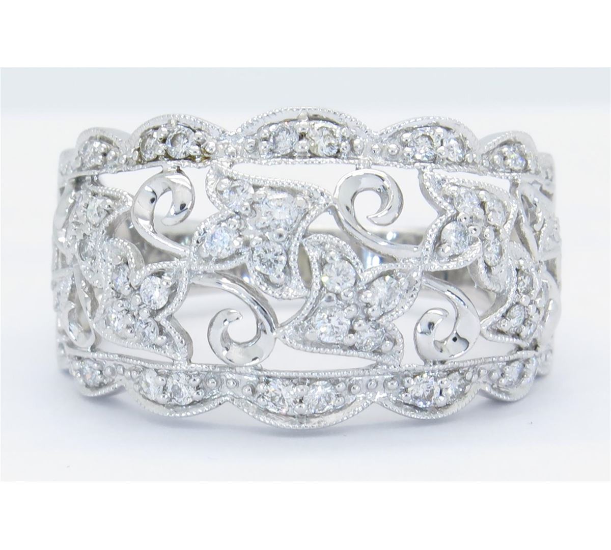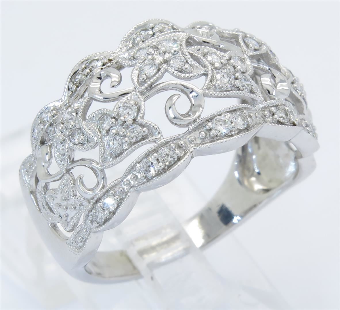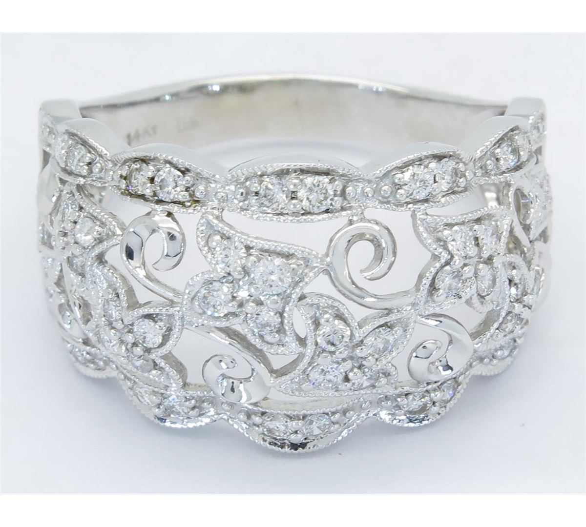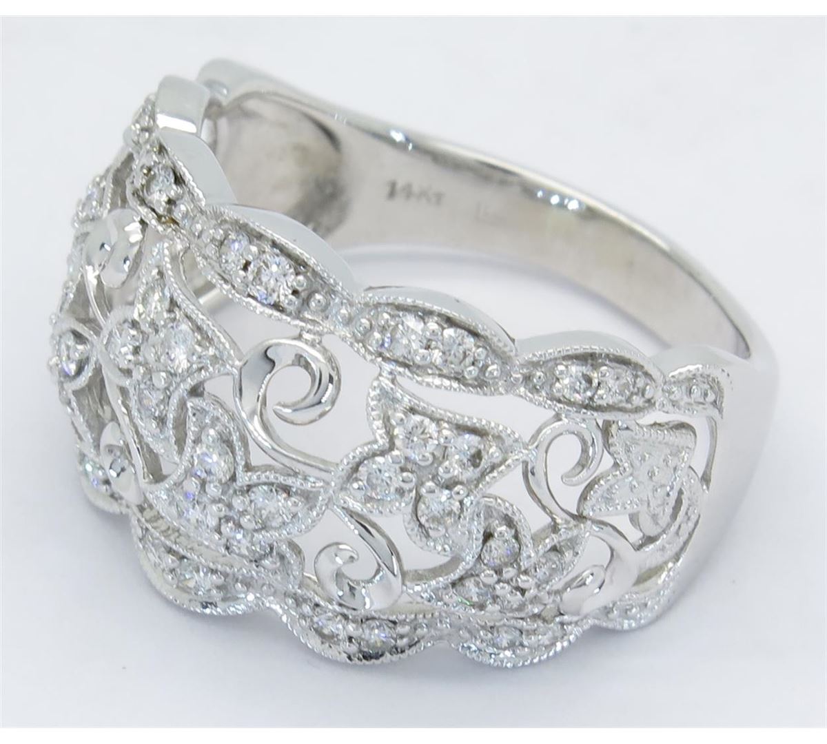 One tested 14K white gold diamond ring. Condition is new. Containing: 44 Round Brilliant Cut Diamonds. Clarity: I-SI, Color: H-I. Approximate total diamond weight: .40CTW. Diamonds are graded in the mounting, unless otherwise stated. Weight of ring: 5.1 grams. Size: 8.75.