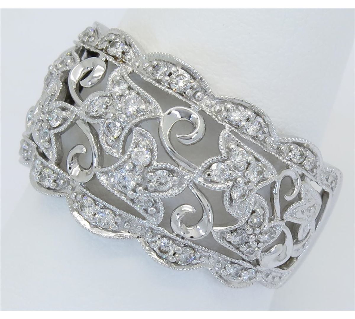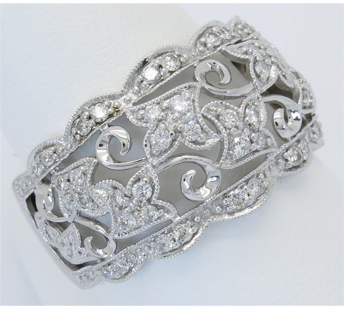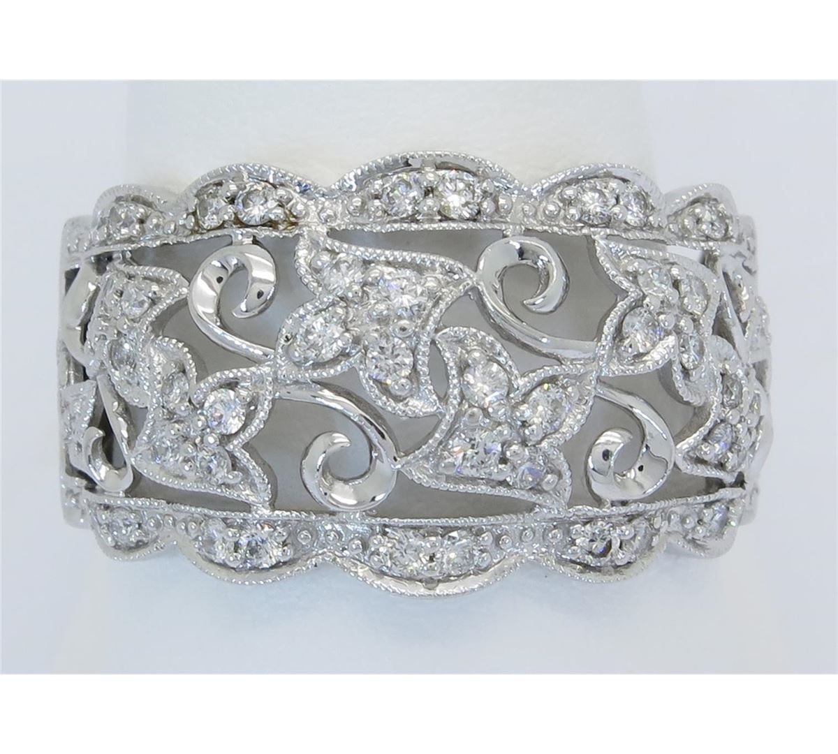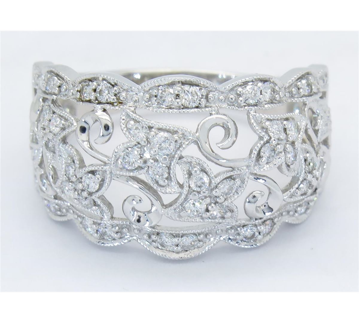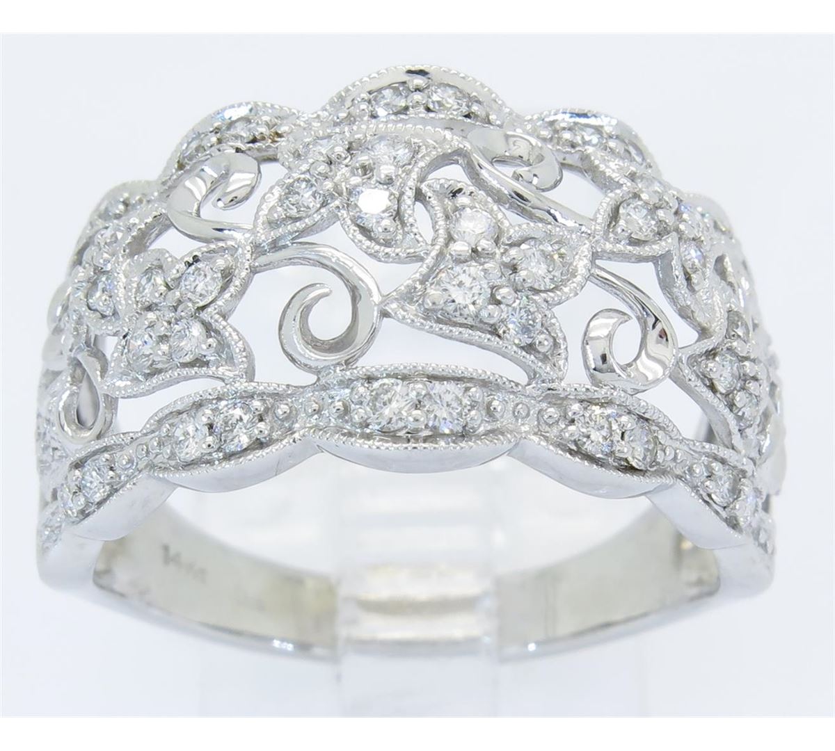 One tested 14K white gold diamond ring. Condition is new. Containing: 44 Round Brilliant Cut Diamonds. Clarity: I-SI, Color: H-I. Approximate total diamond weight: .40CTW. Diamonds are graded in the mounting, unless otherwise stated. Weight of ring: 5.1 grams. Size: 8.75.