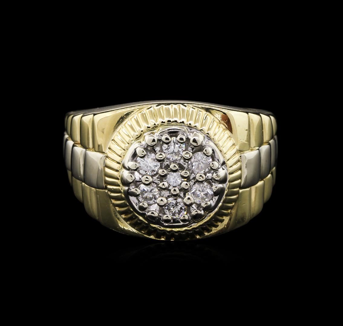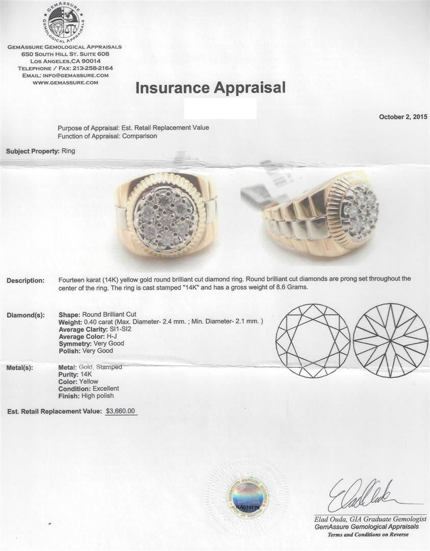 Fourteen karat (14K) yellow gold round brilliant cut diamond ring. Round brilliant cut diamonds are prong set throughout the center of the ring. The ring is cast stamped "14K" and has a gross weight of 8.6 Grams. Diamond(s): Shape: Round Brilliant Cut. Weight: 0.40 carat (Max. Diameter- 2.4 mm. ; Min. Diameter 2.1 mm. ) Average Clarity: SI1-SI2. Average Color: H-J. Symmetry: Very Good. Polish: Very Good. Metal(s): Metal: Gold, Stamped. Purity: 14K. Color: Yellow. Condition: Excellent. Finish: High polish. GGA Appraised.