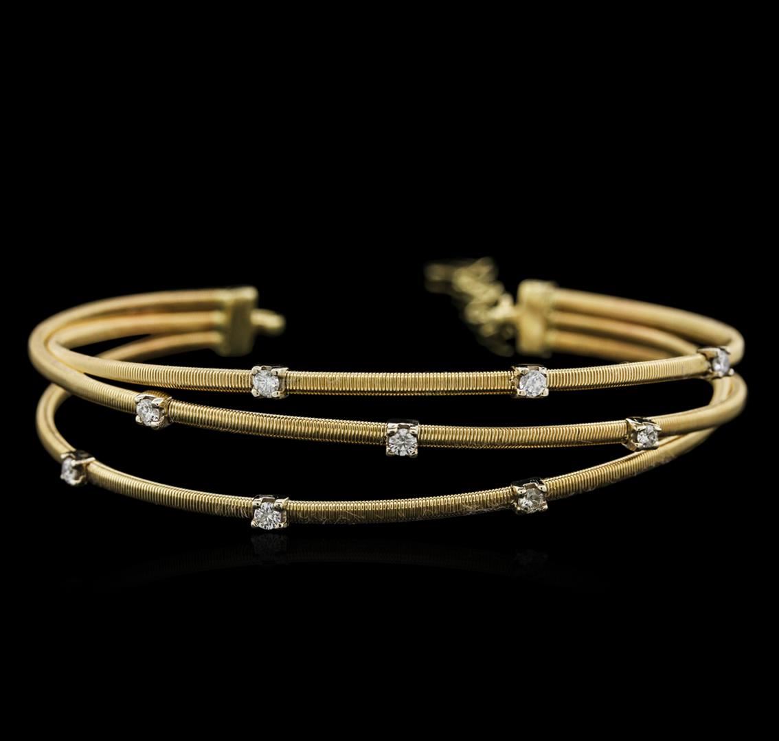 One electronically tested 14KT yellow gold lady's combination cast & assembled fashion bangle bracelet with a bright polished textured finish. The featured lady's cuff bangle bracelet has three braided wire-wrapped ribbons of gold measuring 6 millimeters in width. Identified with markings of "14K". Condition is new, good workmanship. Containing: Nine prong set round brilliant cut diamonds, measuring 2.30 - 2.25 x 1.44mm (depth est.) approximate total weight of 9 Stones = 0.41ct. Graded in the setting. Clarity: SI-2 to I-1. Color: G - H. Cut Good. Total Weight of Diamonds 0.41ct. Total Weight of Bangle Bracelet 14.00gm. GAS Appraised at $3,345.00.
