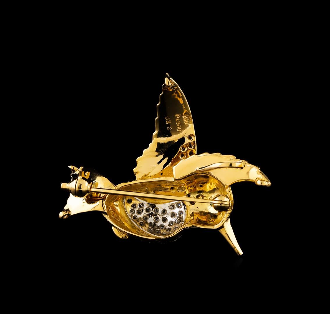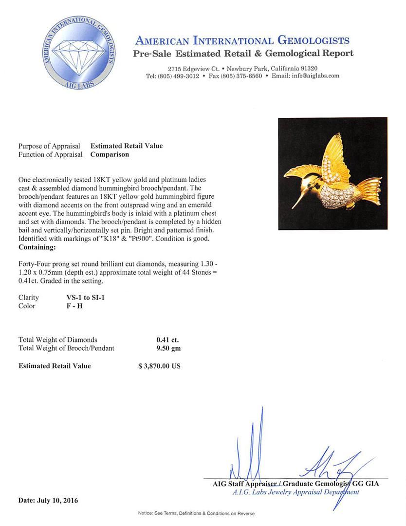 One electronically tested 18KT yellow gold ladies cast & assembled diamond hummingbird brooch/pendant. The brooch/pendant features a 18KT yellow gold hummingbird figure with diamond accents on the front outspread wing and an emerald accent eye. The hummingbird's body is inlaid with a platinum chest and set with diamonds. The brooch/pendant is completed by a hidden bail and vertically/horizontally set pin. Bright and patterned finish. Identified with markings of "K18" & "Pt900". Condition is good. Containing: Forty-Four prong set round brilliant cut diamonds, measuring 1.30 - 1.20 x 0.75mm (depth est.) approximate total weight of 44 Stones = 0.41ct. Graded in the setting. Clarity: VS-1 to SI-1. Color: F - H. Total Weight of Diamonds 0.41ct. Total Weight of Brooch/Pendant 9.50gm. AIG Appraised at $3,870.00.