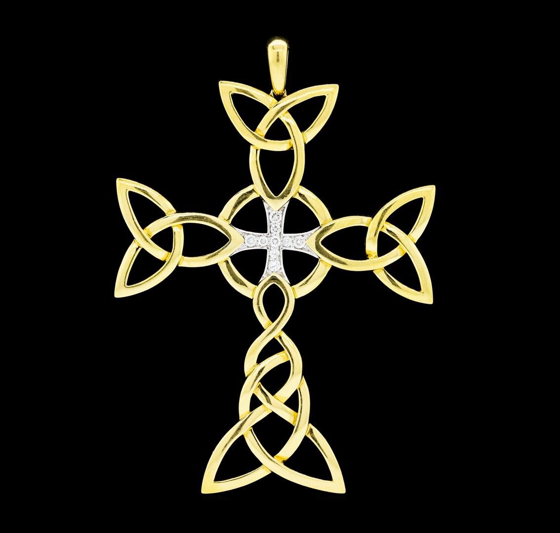 One electronically tested 18KT yellow with rhodium plating gold lady's combination cast & assembled fashion cross pendant with a bright polish finish. The featured cross pendant has a celtic knot motif and measures approximately three and a half inches in length. Identified with markings of '18K'. Condition is new, good workmanship. Containing: Five prong set round brilliant cut diamonds, measuring 2.50 - 2.40 x 1.52mm (depth est.) approximate total weight of 5 Stones = 0.28ct. Graded in the setting. Color H - I Clarity SI-1 to SI-2 Cut Very Good Four prong set round brilliant cut diamonds, measuring 2.10 - 2.00 x 1.27mm (depth est.) approximate total weight of 4 Stones = 0.13ct. Graded in the setting. Color H - I Clarity SI-1 to I-1 Cut Good. Total Weight of Diamonds 0.41ct.. Total Weight of Pendant 24.10gm GAS Appraised at $4420.00. GAS Appraised at $4,420.00.