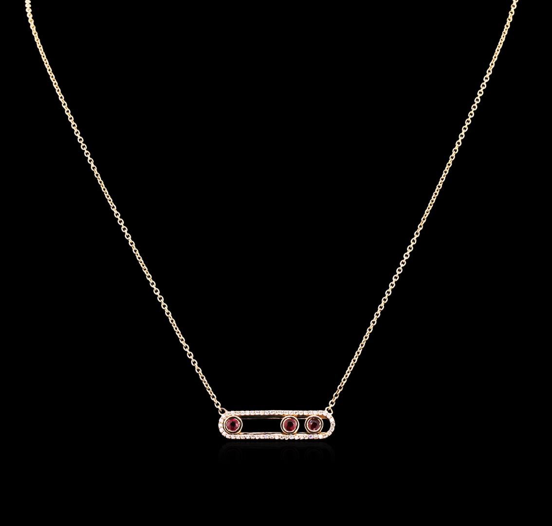 One necklace featuring: 14KT rose gold weighing 6.94 grams containing three rubies with a total weight of 0.41ct and 52 diamonds with a total weight of 0.27ct.