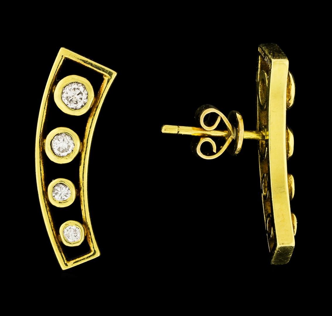 One pair electronically tested 18KT yellow gold lady's combination cast & assembled fashion curve earrings with friction posts with a bright polish finish. Trademark is T & Co. Identified with markings of '18K 750'. Condition is used, good workmanship. Containing: Two bezel set round brilliant cut diamonds, measuring 2.80 - 2.70 x 1.71mm (depth est.) approximate total weight of 2 Stones = 0.16ct. Graded in the setting. Clarity SI-1 to SI-2. Color: H - I Cut Good Two bezel set round brilliant cut diamonds, measuring 2.70 - 2.60 x 1.64mm (depth est.) approximate total weight of 2 Stones = 0.14ct. Graded in the setting. Clarity SI-1 to SI-2. Color: H - I Cut Good Four bezel set round brilliant cut diamonds, measuring 2.00 - 1.90 x 1.21mm (depth est.) approximate total weight of 4 Stones = 0.12ct. Graded in the setting. Clarity SI-1 to I-1. Color: H - I Cut Good. Total Weight of Diamonds 0.42ct.. Total Weight of Earrings 5.70gm. GAS Appraised at $2,080.00.