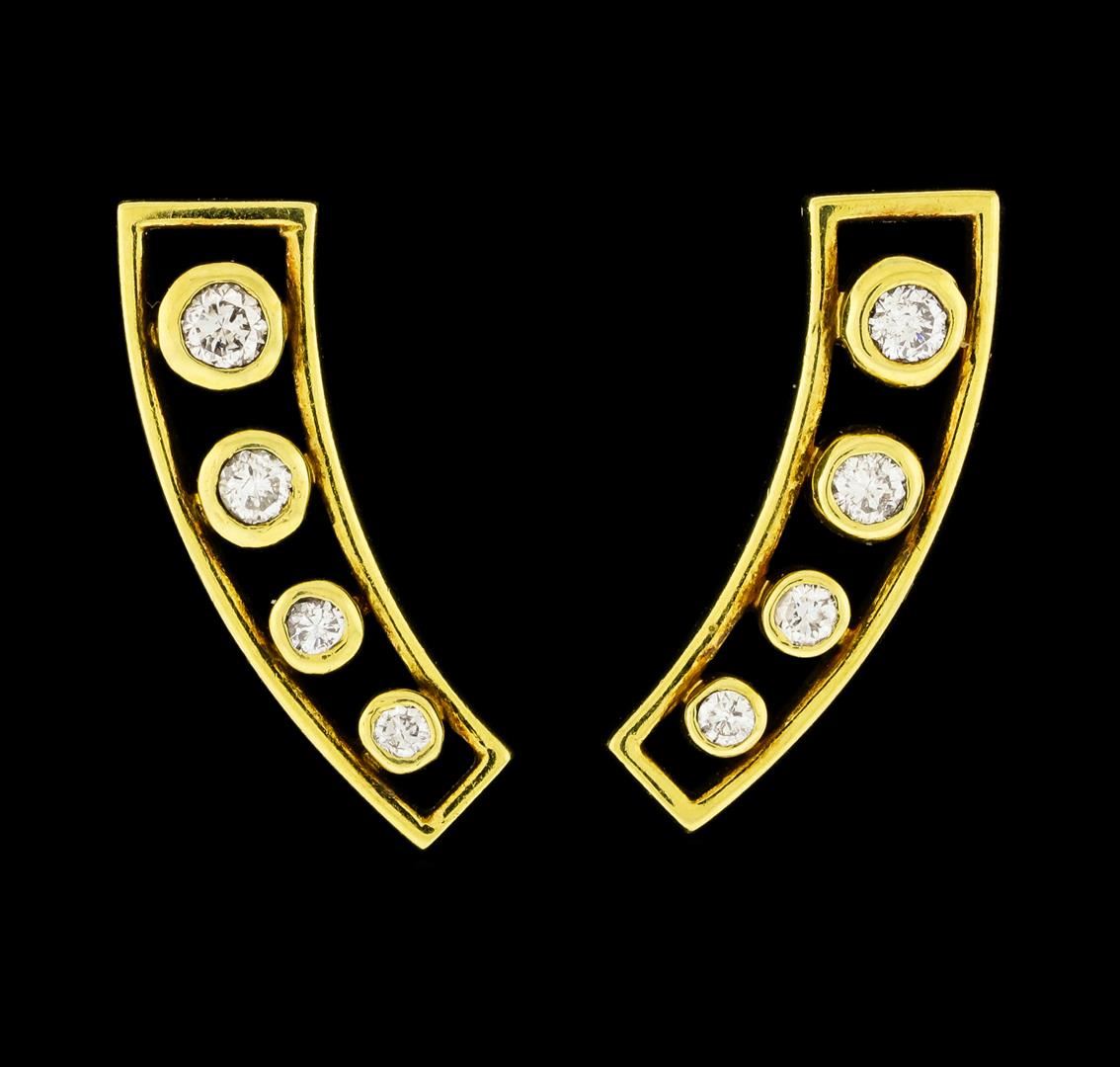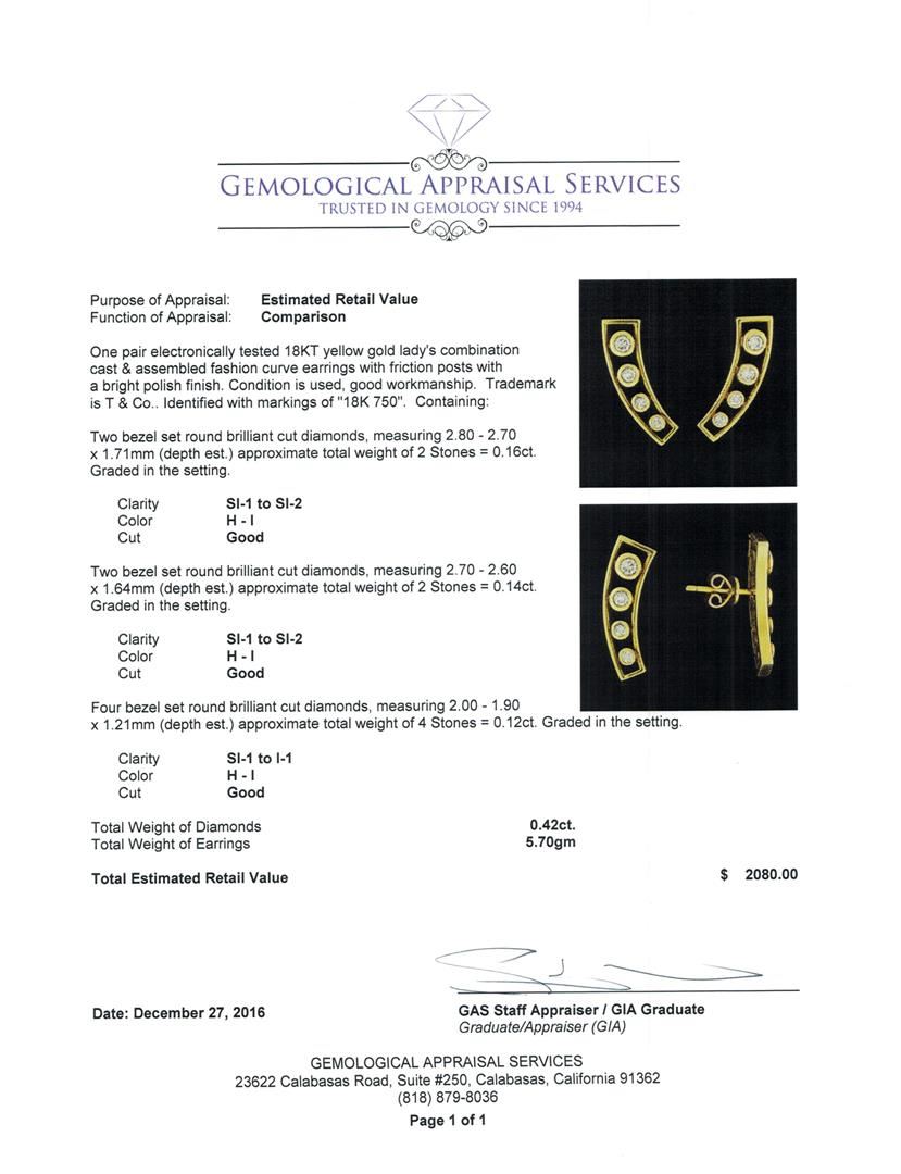 One pair electronically tested 18KT yellow gold lady's combination cast & assembled fashion curve earrings with friction posts with a bright polish finish. Trademark is T & Co. Identified with markings of '18K 750'. Condition is used, good workmanship. Containing: Two bezel set round brilliant cut diamonds, measuring 2.80 - 2.70 x 1.71mm (depth est.) approximate total weight of 2 Stones = 0.16ct. Graded in the setting. Clarity SI-1 to SI-2. Color: H - I Cut Good Two bezel set round brilliant cut diamonds, measuring 2.70 - 2.60 x 1.64mm (depth est.) approximate total weight of 2 Stones = 0.14ct. Graded in the setting. Clarity SI-1 to SI-2. Color: H - I Cut Good Four bezel set round brilliant cut diamonds, measuring 2.00 - 1.90 x 1.21mm (depth est.) approximate total weight of 4 Stones = 0.12ct. Graded in the setting. Clarity SI-1 to I-1. Color: H - I Cut Good. Total Weight of Diamonds 0.42ct.. Total Weight of Earrings 5.70gm. GAS Appraised at $2,080.00.