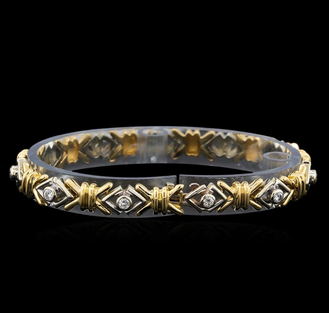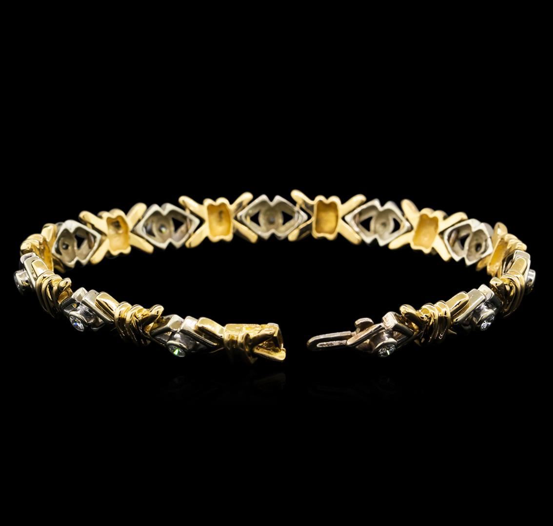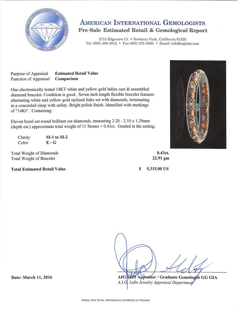 One electronically tested 14KT white and yellow gold ladies cast & assembled diamond bracelet. Seven inch length flexible bracelet features alternating white and yellow gold stylized links set with diamonds, terminating in a concealed clasp with safety. Bright polish finish. Identified with markings of "14Kt". Condition is good. Containing: Eleven bezel set round brilliant cut diamonds, measuring 2.20 - 2.10 x 1.29mm (depth est.) approximate total weight of 11 Stones = 0.43ct. Graded in the setting. Clarity: SI-1 to SI-2. Color: E - G. Total Weight of Diamonds 0.43ct. Total Weight of Bracelet 22.91gm. AIG Appraised at $5,315.00.