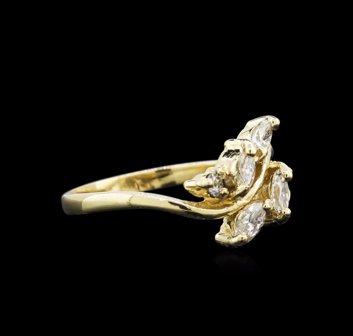 One electronically tested 14KT yellow gold lady's cast fashion ring with a bypass shank with a bright polish finish. The featured lady's ring has a shank measuring 1.85 millimeters in width. Identified with markings of "14K". Condition is new, good workmanship. Containing: Four prong set marquise shaped cut diamonds, measuring 4.00 x 2.50 x 1.57mm (depth est.) approximate total weight of 4 Stones = 0.36ct. Graded in the setting. Clarity: SI-1 to SI-2. Color: H - I. Cut Good Two prong set round brilliant cut diamonds, measuring 2.20 - 2.10 x 1.29mm (depth est.) approximate total weight of 2 Stones = 0.07ct. Graded in the setting. Clarity: I-1. Color: J - Good. Total Weight of Diamonds 0.43ct. Total Weight of Ring 2.20gm. GAS Appraised at $1,485.00.