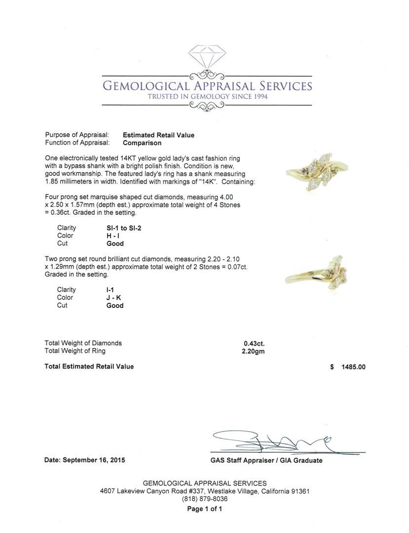One electronically tested 14KT yellow gold lady's cast fashion ring with a bypass shank with a bright polish finish. The featured lady's ring has a shank measuring 1.85 millimeters in width. Identified with markings of "14K". Condition is new, good workmanship. Containing: Four prong set marquise shaped cut diamonds, measuring 4.00 x 2.50 x 1.57mm (depth est.) approximate total weight of 4 Stones = 0.36ct. Graded in the setting. Clarity: SI-1 to SI-2. Color: H - I. Cut Good Two prong set round brilliant cut diamonds, measuring 2.20 - 2.10 x 1.29mm (depth est.) approximate total weight of 2 Stones = 0.07ct. Graded in the setting. Clarity: I-1. Color: J - Good. Total Weight of Diamonds 0.43ct. Total Weight of Ring 2.20gm. GAS Appraised at $1,485.00.