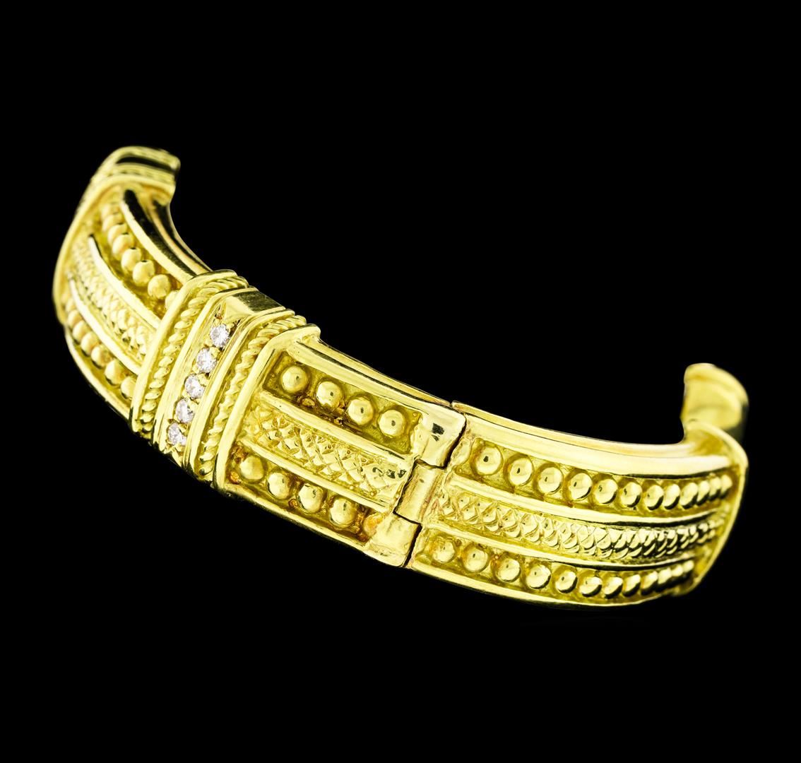 One electronically tested 18KT yellow gold ladies cast & assembled diamond cuff bracelet. Six and one-quarter inch wearable length cuff style bracelet featuring stylized beaded detailing with three vertical diamond ribbon accents, completed by a hinged opening shoulder. Measures thirteen to fifteen millimeters wide. Bright and patterned finish. Trademark is Judith Ripka. Identified with markings of '18K'. Condition is good. Containing: Fifteen prong set round brilliant cut diamonds, measuring 2.00 - 2.00 x 1.20mm (depth est.) approximate total weight of 15 Stones = 0.44ct. Graded in the setting. Clarity VS-1 to VS-2. Color: F - H. Total Weight of Diamonds 0.44ct.. Total Weight of Bracelet 70.19gm. AIG Appraised at $8,500.00.
