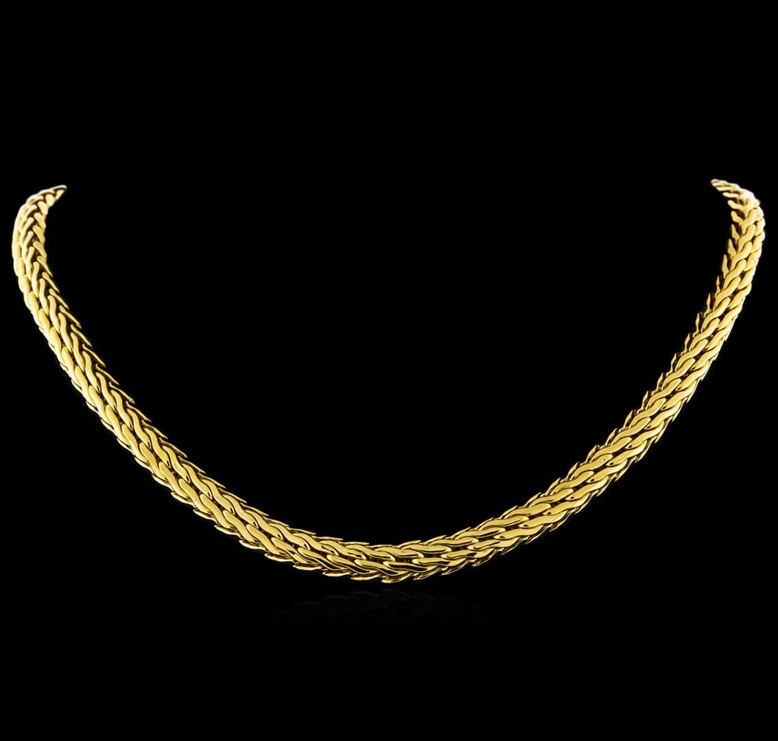 One electronically tested 18KT yellow and white gold ladies cast & assembled black diamond necklace. Seventeen and one-half inch length necklace features a flexible one-quarter inch woven yellow gold ribbon, terminating in an elaborate white gold and black diamond accented buckle clasp with black crystal cabochon accents. Bright and anodized finish. Identified with markings of "750". Condition is new, good workmanship. Containing: Twenty-Eight bead set round brilliant cut diamonds, measuring 1.60 - 1.50 x 0.93mm (depth est.) approximate total weight of 28 Stones = 0.45ct. Indications of multiple laboratory enhancements. The specific gravity of black diamond is 3.120 to 3.165. Diamond tester results are non-reactive. Graded in the setting. Clarity Déclassé,. Color: Fancy Black; Irradiated. Total Weight of Diamonds 0.45ct. Total Weight of Necklace 32.02gm. AIG Appraised at $7,685.00.