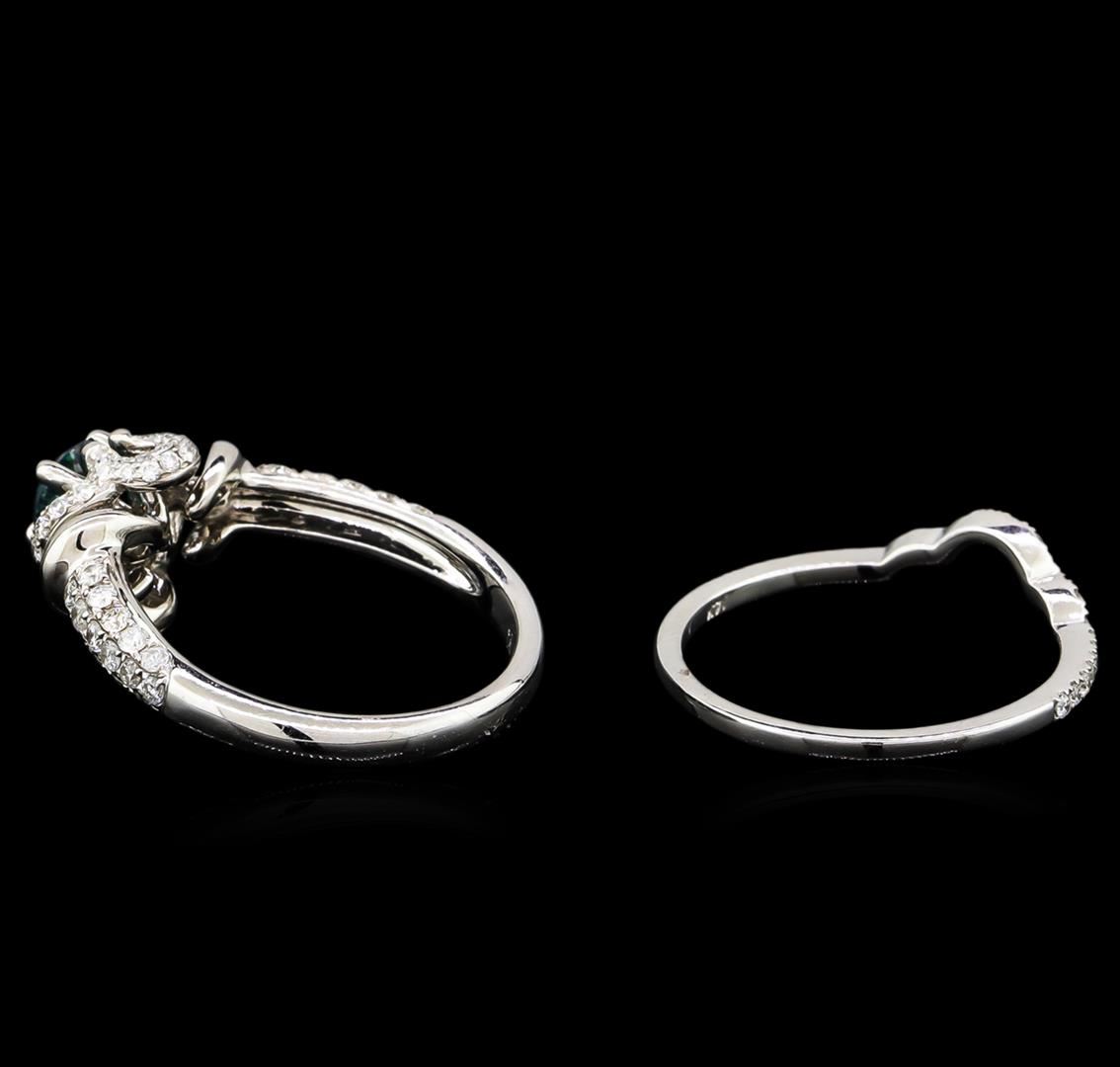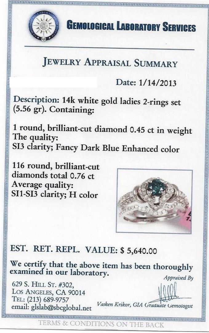 One 14k white gold ladies 2-rings set (5.56 gr). Containing: 1 round, brilliant-cut diamond 0.45 ct in weight. The quality: SI3 clarity; fancy dark blue enhanced color. 116 round, brilliant-cut diamonds total 0.76 ct average quality: SI1-SI3 clarity; H color. GLS Appraised at $5,640.00.