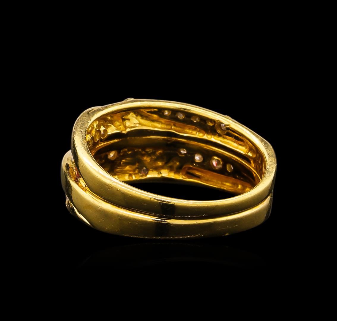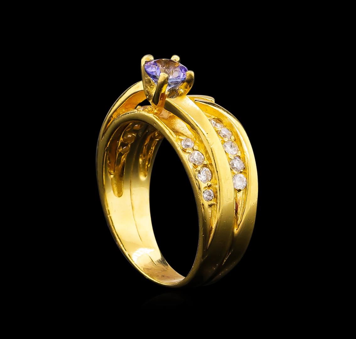 One set electronically tested 18KT yellow gold lady's combination cast & assembled wedding ring soldered to wedding band with a cathedral shank with a bright polish finish. The featured lady's ring has a double shank measuring 4.10 millimeters wide. Identified with markings of "750". Condition is used. Containing: One prong set round modified brilliant cut natural tanzanite, measuring 4.61 - 4.58 x 2.99 mm, approximate weight of 0.45ct., clarity is slightly included, type I, medium light, very slightly grayish, bluish violet color, (GIA bV 4/3), cut is good. Transmitting light with a minimum of distortion, transparent. Colored gemstones are presumed to have been subjected to commonly used enhancement processes. Graded in the setting. Twenty prong set round brilliant cut diamonds, measuring 1.80 - 1.40 x 0.99mm (depth est.) approximate total weight of 20 Stones = 0.31ct. Graded in the setting. Clarity: SI-2 to I-2. Color: G - Good. Total Weight of Colored Stones 0.45ct. Total Weight of Diamonds 0.31ct. Total Weight of Ring Soldered To Wedding Band 6.90gm. GAS Appraised at $1,680.00.