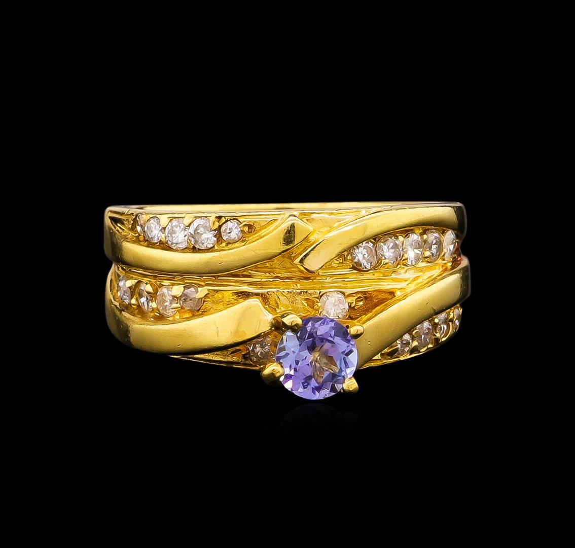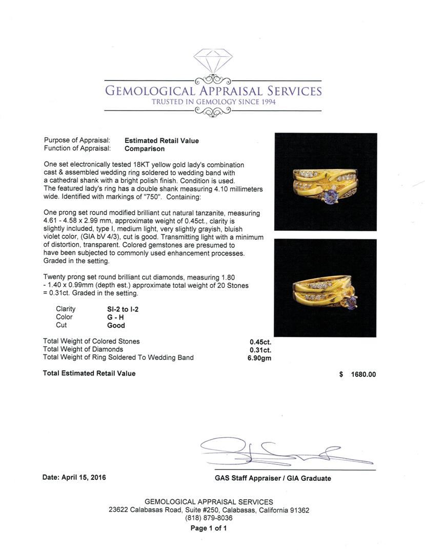 One set electronically tested 18KT yellow gold lady's combination cast & assembled wedding ring soldered to wedding band with a cathedral shank with a bright polish finish. The featured lady's ring has a double shank measuring 4.10 millimeters wide. Identified with markings of "750". Condition is used. Containing: One prong set round modified brilliant cut natural tanzanite, measuring 4.61 - 4.58 x 2.99 mm, approximate weight of 0.45ct., clarity is slightly included, type I, medium light, very slightly grayish, bluish violet color, (GIA bV 4/3), cut is good. Transmitting light with a minimum of distortion, transparent. Colored gemstones are presumed to have been subjected to commonly used enhancement processes. Graded in the setting. Twenty prong set round brilliant cut diamonds, measuring 1.80 - 1.40 x 0.99mm (depth est.) approximate total weight of 20 Stones = 0.31ct. Graded in the setting. Clarity: SI-2 to I-2. Color: G - Good. Total Weight of Colored Stones 0.45ct. Total Weight of Diamonds 0.31ct. Total Weight of Ring Soldered To Wedding Band 6.90gm. GAS Appraised at $1,680.00.
