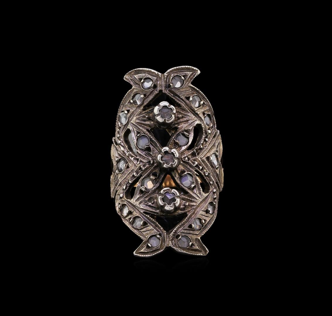 One electronically tested 10KT gold and silver gold ladies cast & assembled white sapphire ring. The ring features a series of three white sapphires set within an elaborate white gold and silver gallery with white sapphire accents, completed by a rose gold two and one-half millimeter wide band. Bright and anodized finish with milgrain detailing. Condition is good. Containing: Twenty-one prong & bead set rose cut natural white sapphires, measuring 2.10 x 2.00. x 0.45mm, approximate total weight of 0.45ct., clarity is eye clean, colorless, very slightly grayish, white color, (GIA W 0/3), cut is good. Transmitting light with no distortion, transparent. Color grade is an average for the group. Graded in the setting. Total Weight of Colored Stones 0.45ct.. Total Weight of Ring 6.61gm. AIG Appraised at $1,080.00.