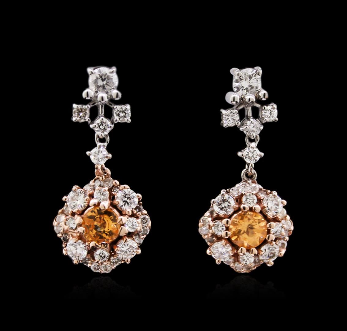 One pair of earrings featuring: 14KT rose and white gold weighing 3.38 grams containing 2 orange sapphires with a total weight of 0.45ct and diamonds with a total weight of 0.79ct.