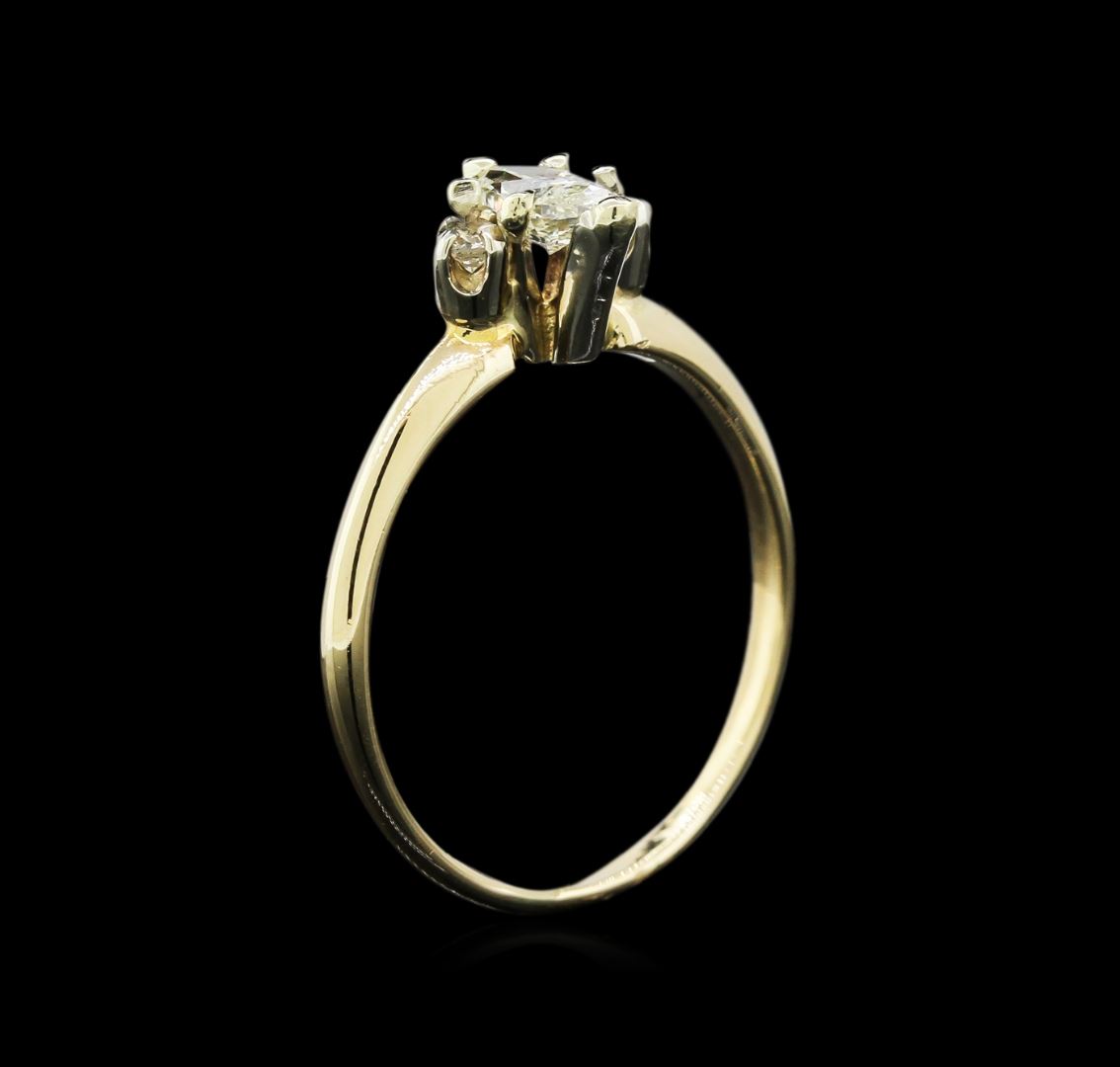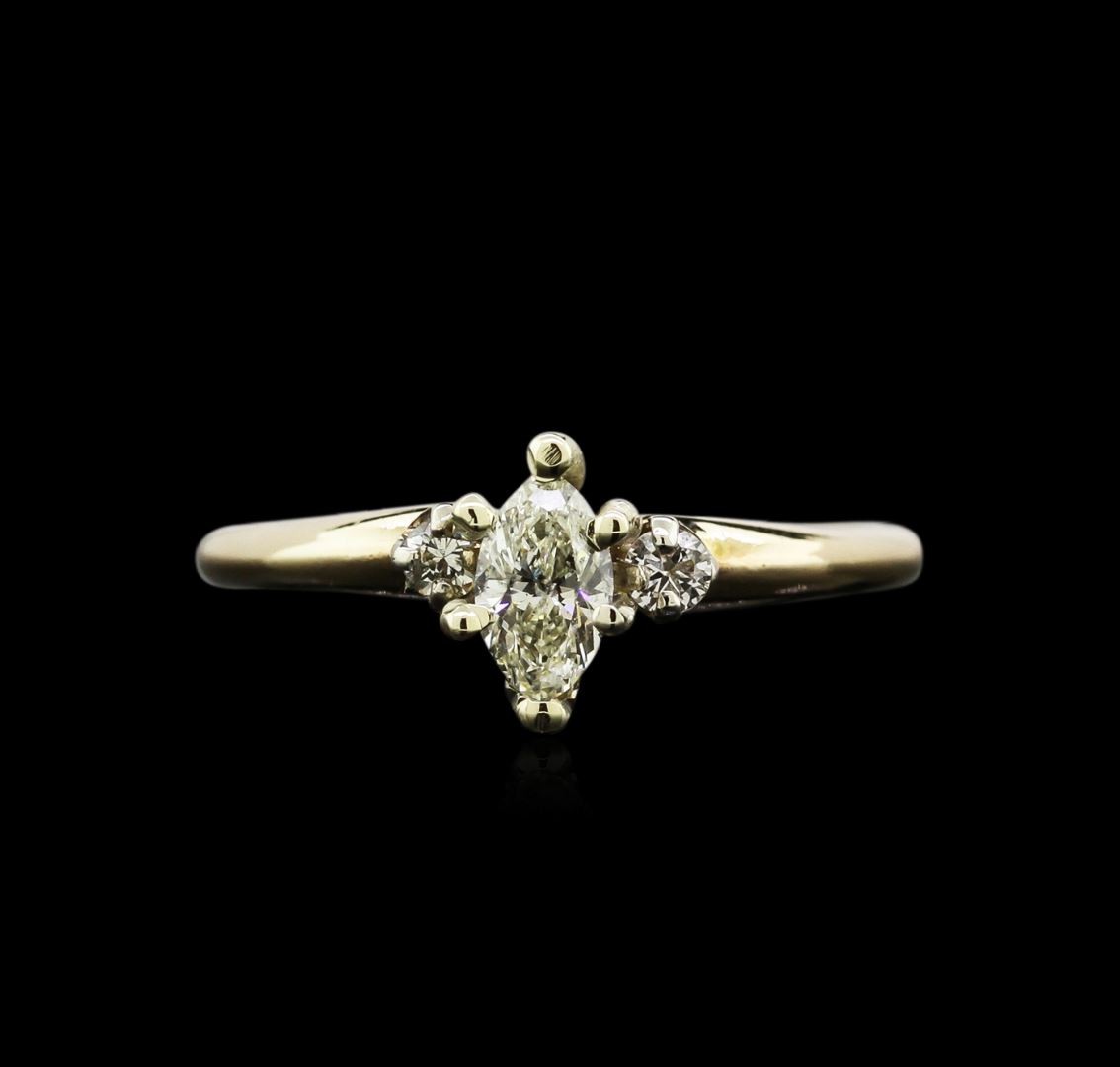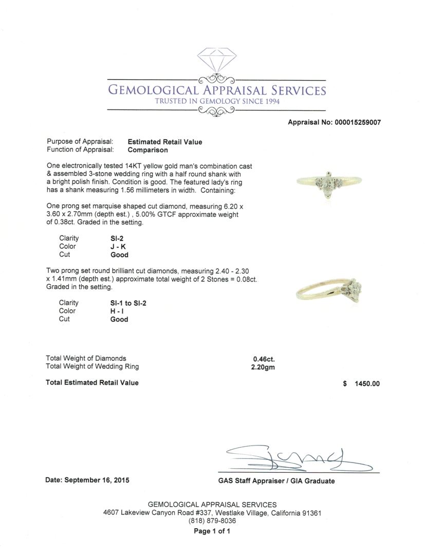 One electronically tested 14KT yellow gold man's combination cast & assembled 3-stone wedding ring with a half round shank with a bright polish finish. The featured lady's ring has a shank measuring 1.56 millimeters in width. Condition is good. Containing: One prong set marquise shaped cut diamond, measuring 6.20 x 3.60 x 2.70mm (depth est.) , 5.00.%. GTCF approximate weight of 0.38ct. Graded in the setting. Clarity: SI-2. Color: J - Good Two prong set round brilliant cut diamonds, measuring 2.40 - 2.30 x 1.41mm (depth est.) approximate total weight of 2 Stones = 0.08ct. Graded in the setting. Clarity: SI-1 to SI-2. Color: H - I. Cut Good. Total Weight of Diamonds 0.46ct. Total Weight of Wedding Ring 2.20gm. GAS Appraised at $1,450.00.