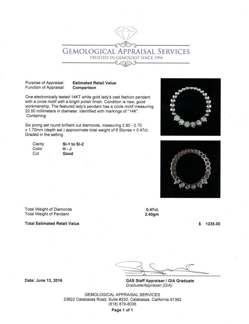 One electronically tested 14KT white gold lady's cast fashion pendant with a circle motif with a bright polish finish. The featured lady's pendant has a circle motif measuring 20.50 millimeters in diameter. Identified with markings of "14K". Condition is new, good workmanship. Containing: Six prong set round brilliant cut diamonds, measuring 2.80 - 2.70 x 1.70mm (depth est.) approximate total weight of 6 Stones = 0.47ct. Graded in the setting. Clarity: SI-1 to SI-2. Color: H - Good. Total Weight of Diamonds 0.47ct. Total Weight of Pendant 2.40gm. GAS Appraised at $1,235.00.