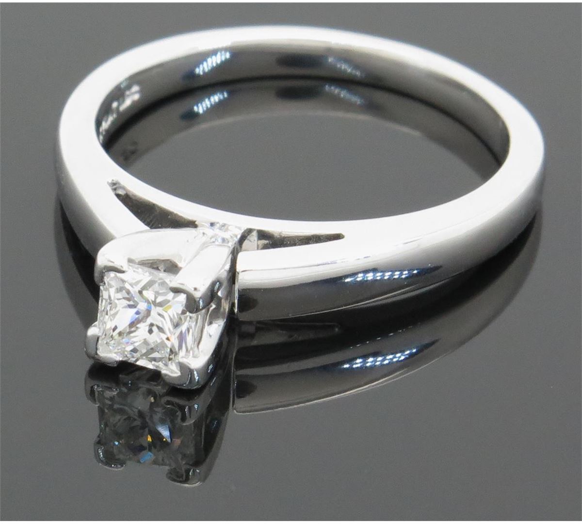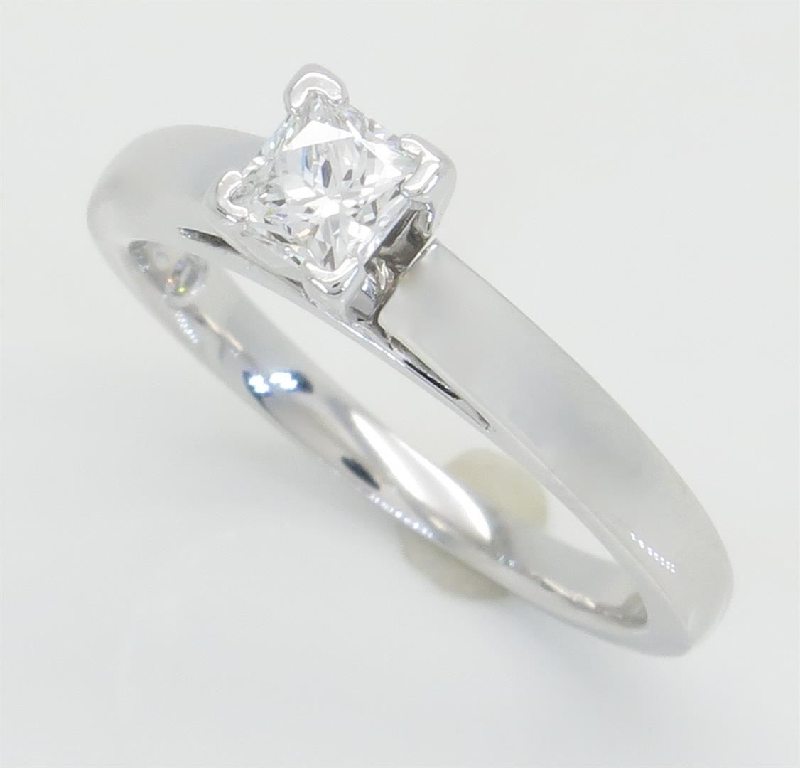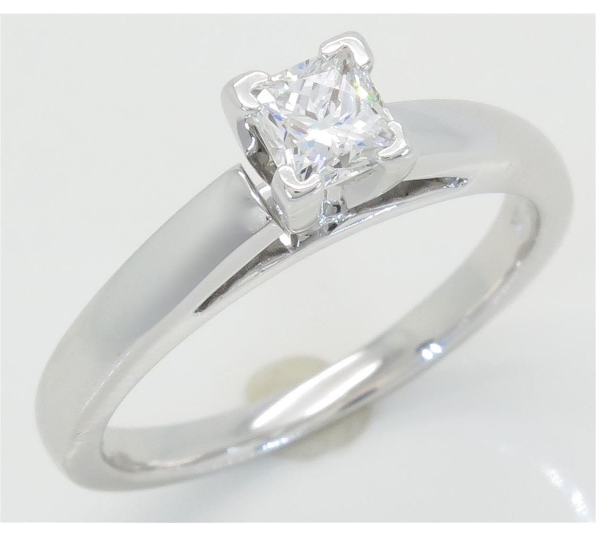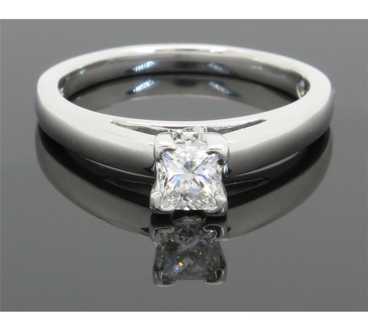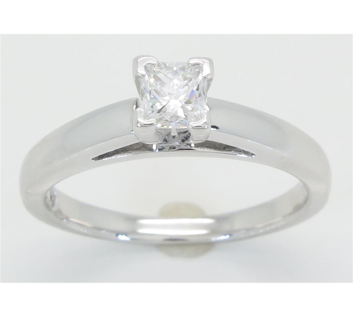 One tested 14K white gold diamond ring. Containing: One IGI Certified Leo Princess Cut Diamond. Size: .47CT, Clarity: SI2, Color: E. Diamonds are graded in the mounting, unless otherwise stated. Weight: 4.4 grams, Size: 6.75.