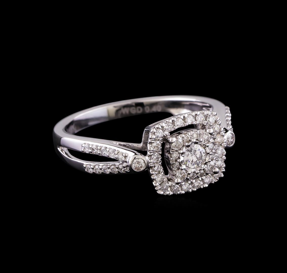 One electronically tested 14KT white gold lady's cast wedding ring with a split shank cathedral halo with a bright polish finish. The featured lady's ring has a shank measuring 2.21 millimeters in width. Identified with markings of '14K'. Condition is new, good workmanship. Containing: One prong set round brilliant cut diamond, measuring 3.00 - 2.95 x 1.85mm (depth est.) approximate weight of 0.10ct. Graded in the setting. Clarity SI-2. Color: H Cut Good Six prong set round brilliant cut diamonds, measuring 1.70 - 1.60 x 1.02mm (depth est.) approximate total weight of 6 Stones = 0.10ct. Graded in the setting. Clarity SI-1 to SI-2. Color: H - I Cut Good Forty-Eight prong set round brilliant cut diamonds, measuring 1.20 - 1.10 x 0.71mm (depth est.) approximate total weight of 48 Stones = 0.27ct. Graded in the setting. Clarity SI-1 to SI-2. Color: H - I Cut Good. Total Weight of Diamonds 0.47ct.. Total Weight of Ring 3.30gm. GAS Appraised at $2,140.00.