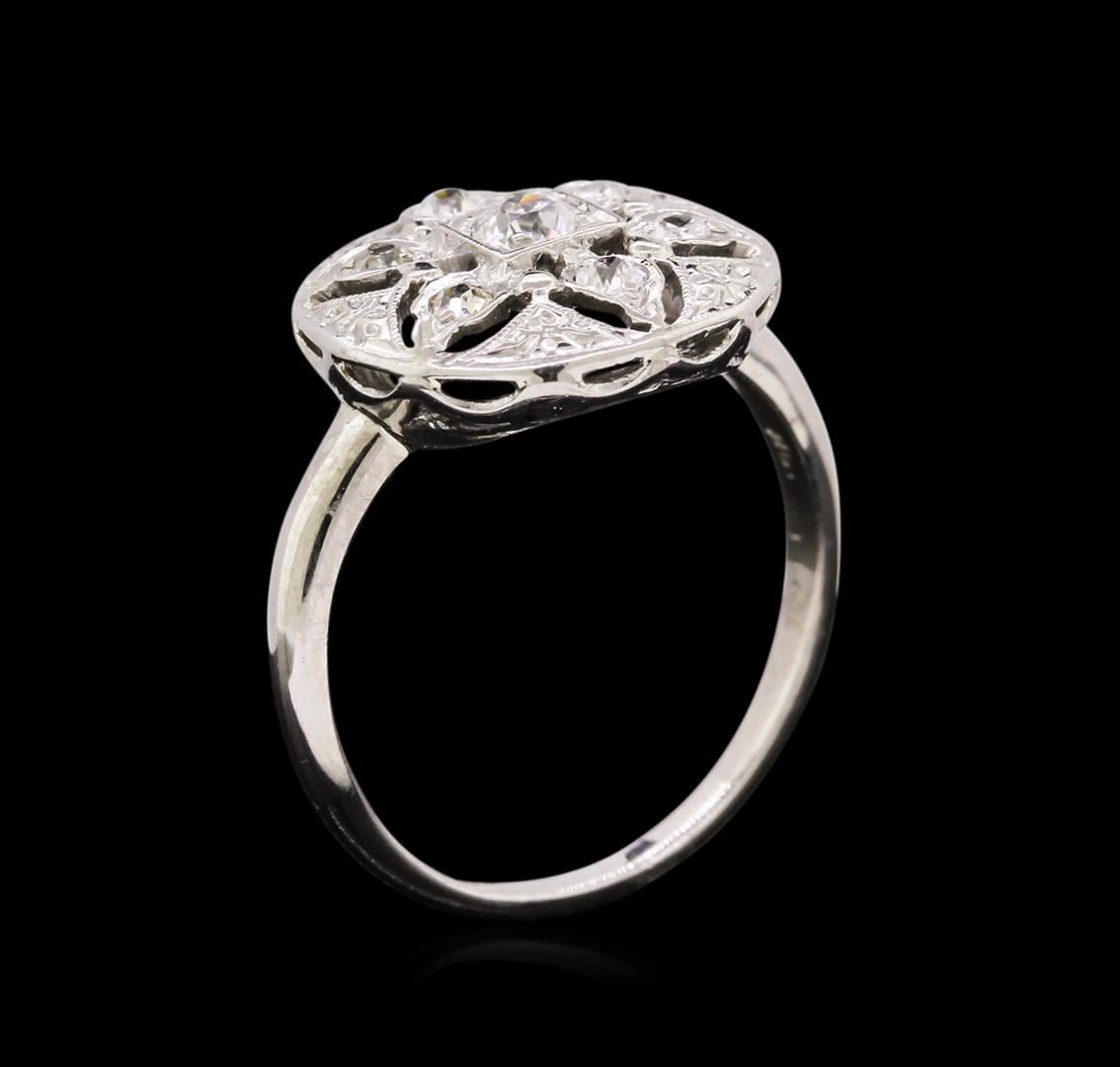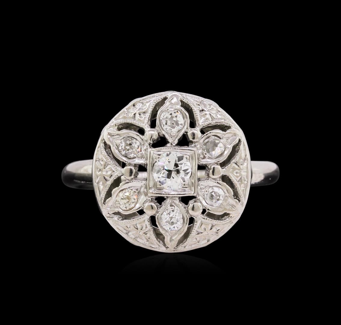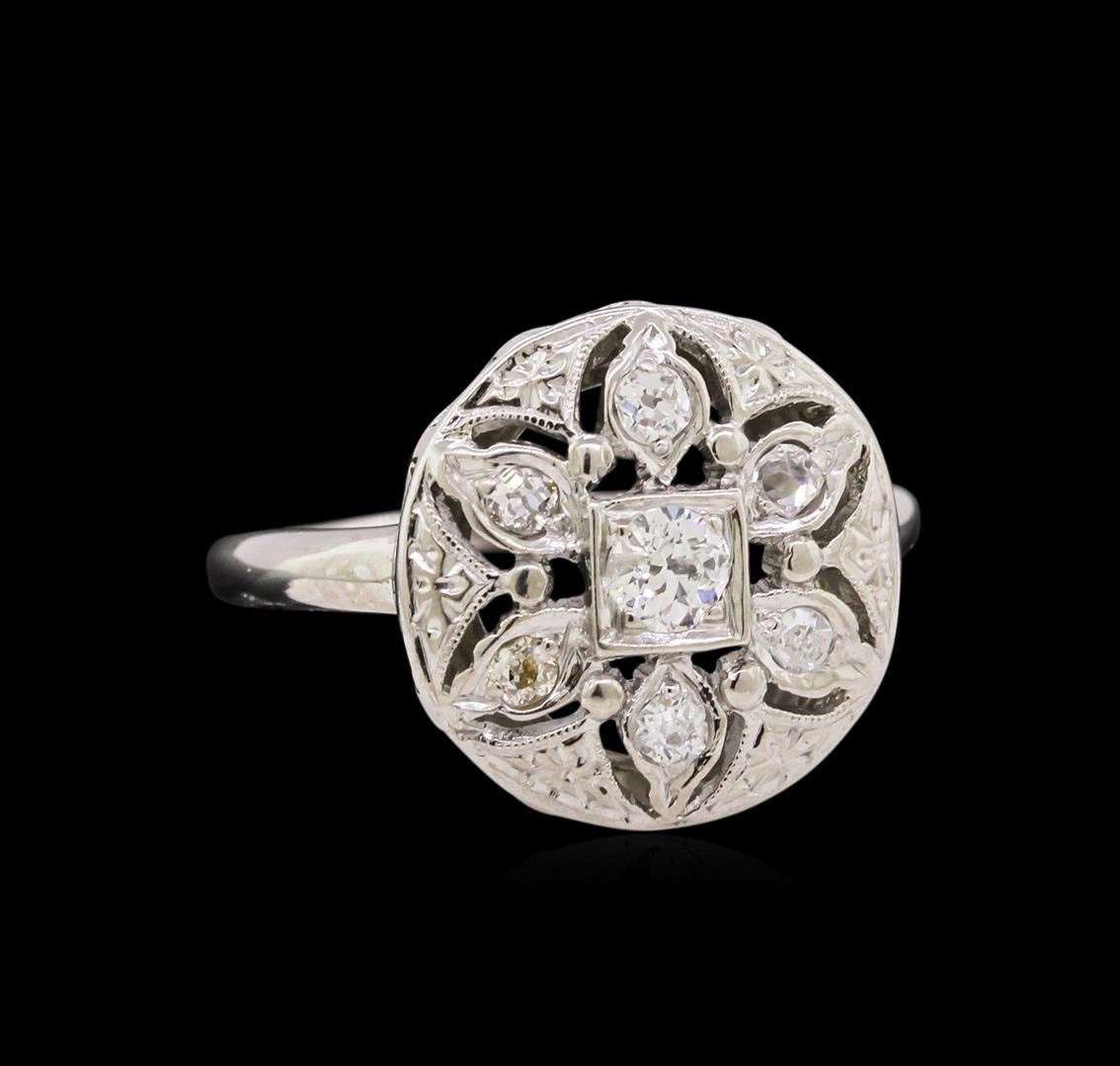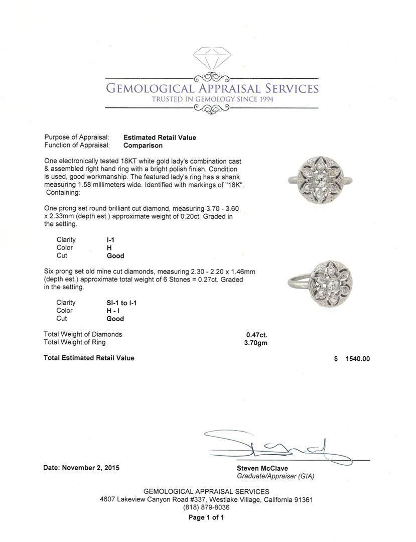 One electronically tested 18KT white gold lady's combination cast & assembled right hand ring with a bright polish finish. The featured lady's ring has a shank measuring 1.58 millimeters wide. Identified with markings of "18K". Condition is used, good workmanship. Containing: One prong set round brilliant cut diamond, measuring 3.70 - 3.60 x 2.33mm (depth est.) approximate weight of 0.20ct. Graded in the setting. Clarity: I-1. Color: Good Six prong set old mine cut diamonds, measuring 2.30 - 2.20 x 1.46mm (depth est.) approximate total weight of 6 Stones = 0.27ct. Graded in the setting. Clarity: SI-1 to I-1. Color: H - I. Cut Good. Total Weight of Diamonds 0.47ct. Total Weight of Ring 3.70gm. GAS Appraised at $1,540.00.