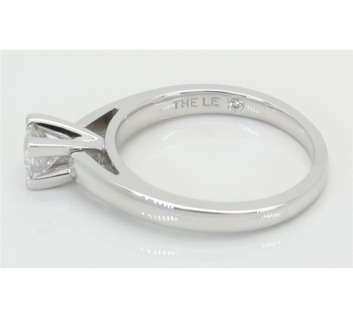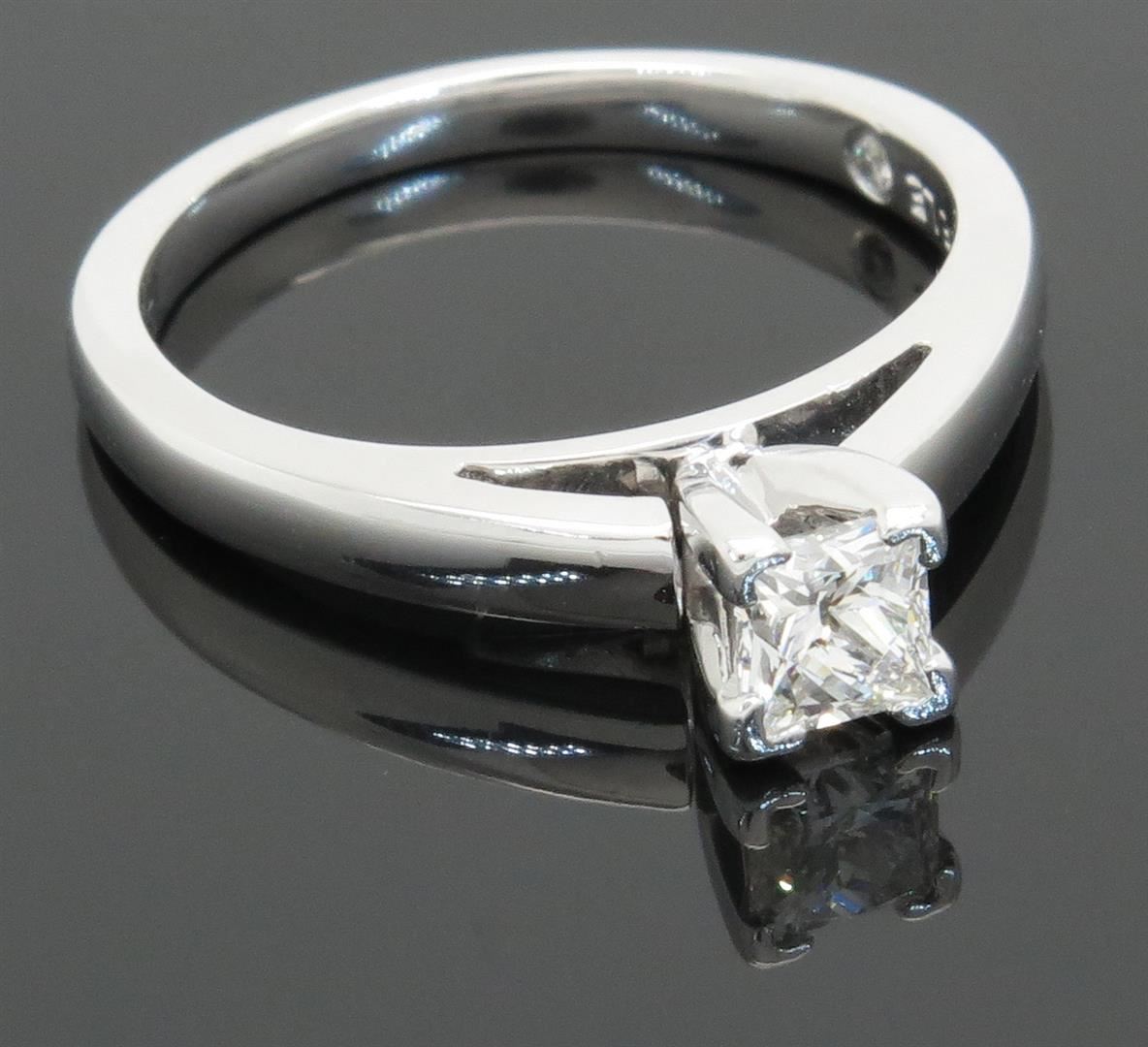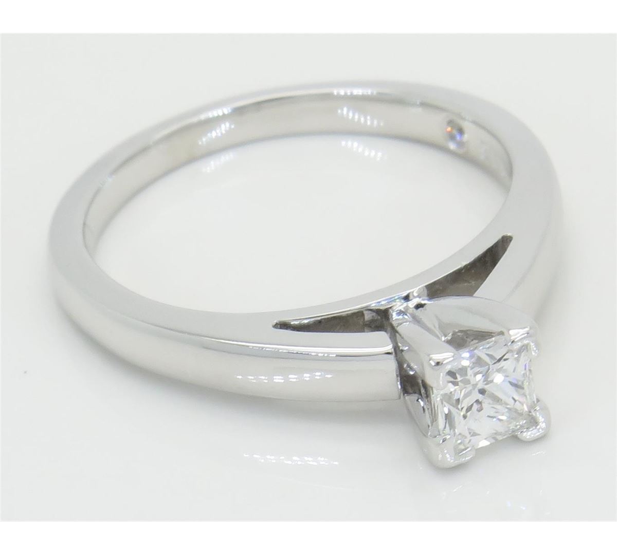 One tested 14K white gold diamond ring. Containing: One IGI Certified Leo Princess Cut Diamond. Size: .47CT, Clarity: SI2, Color: E. Diamonds are graded in the mounting, unless otherwise stated. Weight: 4.4 grams, Size: 6.75.