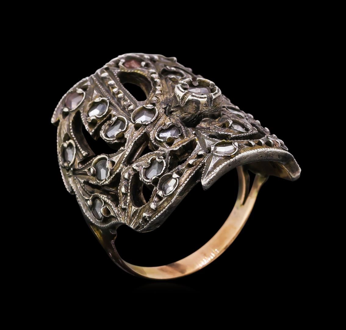 One electronically tested 10KT gold and silver gold ladies cast & assembled white sapphire ring. The ring features a white sapphire center set within an elaborate white gold and silver gallery with white sapphire accents, completed by a rose gold two and one-half millimeter wide band. Bright and anodized finish with milgrain detailing. Condition is good. Containing: Twenty-three prong set rose cut natural white sapphires, measuring 2.10 x 2.00. x 0.45mm, approximate total weight of 0.49ct., clarity is eye clean, colorless, very slightly grayish, white color, (GIA W 0/3), cut is good. Transmitting light with no distortion, transparent. Color grade is an average for the group. Graded in the setting. Total Weight of Colored Stones 0.49ct.. Total Weight of Ring 8.46gm. AIG Appraised at $1,330.00.