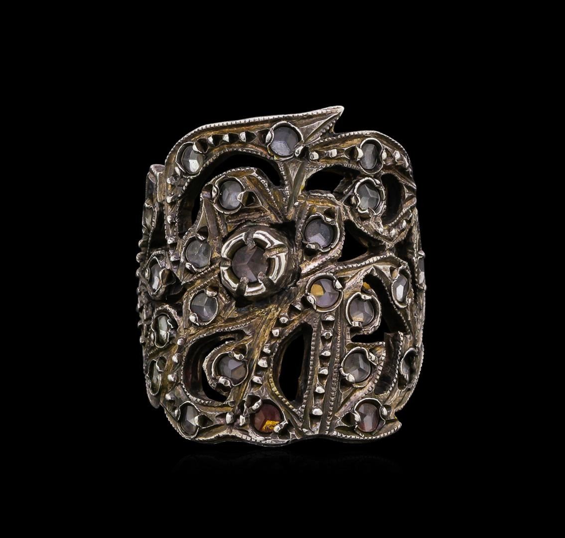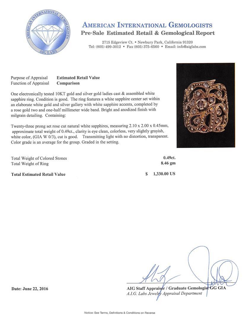 One electronically tested 10KT gold and silver gold ladies cast & assembled white sapphire ring. The ring features a white sapphire center set within an elaborate white gold and silver gallery with white sapphire accents, completed by a rose gold two and one-half millimeter wide band. Bright and anodized finish with milgrain detailing. Condition is good. Containing: Twenty-three prong set rose cut natural white sapphires, measuring 2.10 x 2.00. x 0.45mm, approximate total weight of 0.49ct., clarity is eye clean, colorless, very slightly grayish, white color, (GIA W 0/3), cut is good. Transmitting light with no distortion, transparent. Color grade is an average for the group. Graded in the setting. Total Weight of Colored Stones 0.49ct.. Total Weight of Ring 8.46gm. AIG Appraised at $1,330.00.