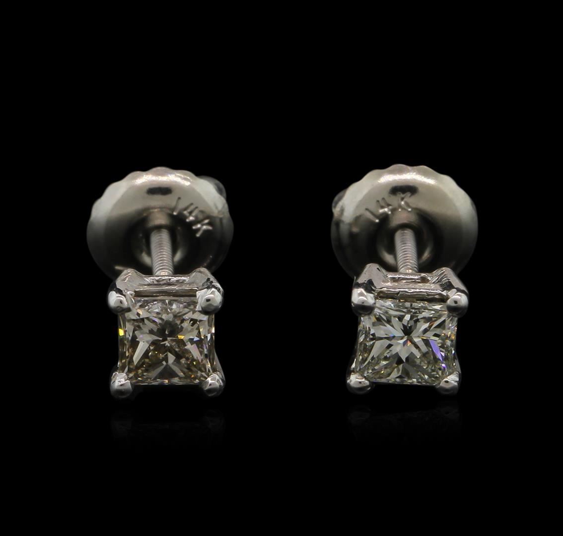 One pair of stud earrings featuring: 14KT white gold weighing 0.55 grams containing prong set princess cut diamonds with a total weight of 0.49ct.