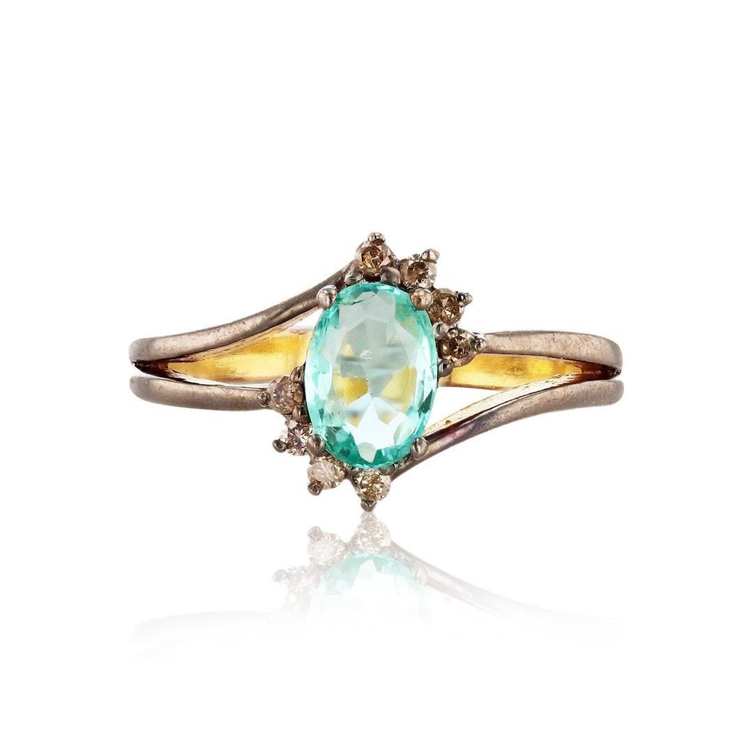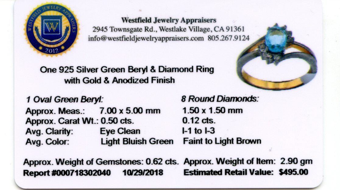 0.50ct Aquamarine and 0.12ctw Diamond Silver Ring. One electronically tested 925 silver ladies cast & assembled green beryl & diamond ring. Containing: One prong set oval mixed cut natural aquamarine, measuring 7.00 x 5.00 x 2.50mm, approximate weight of 0.50ct., clarity is eye clean, type I, medium, very slightly grayish, very strongly greenish blue color, (GIA vstgB 5/3), cut is good. Eight prong set round brilliant cut diamonds, measuring 1.50 - 1.50 x 0.90mm (depth est.) approximate total weight of 8 Stones = 0.12ctw. Clarity I-1 to I-3 Total Weight of Colored Stones 0.50ct. Total Weight of Diamonds 0.12ctw. Total Weight of Ring 2.90 gm