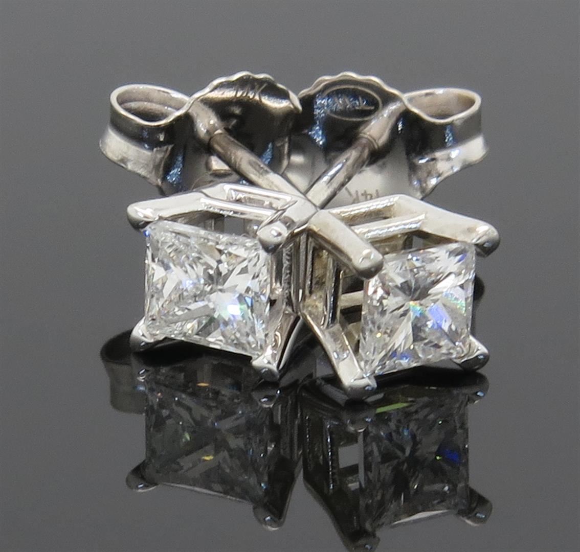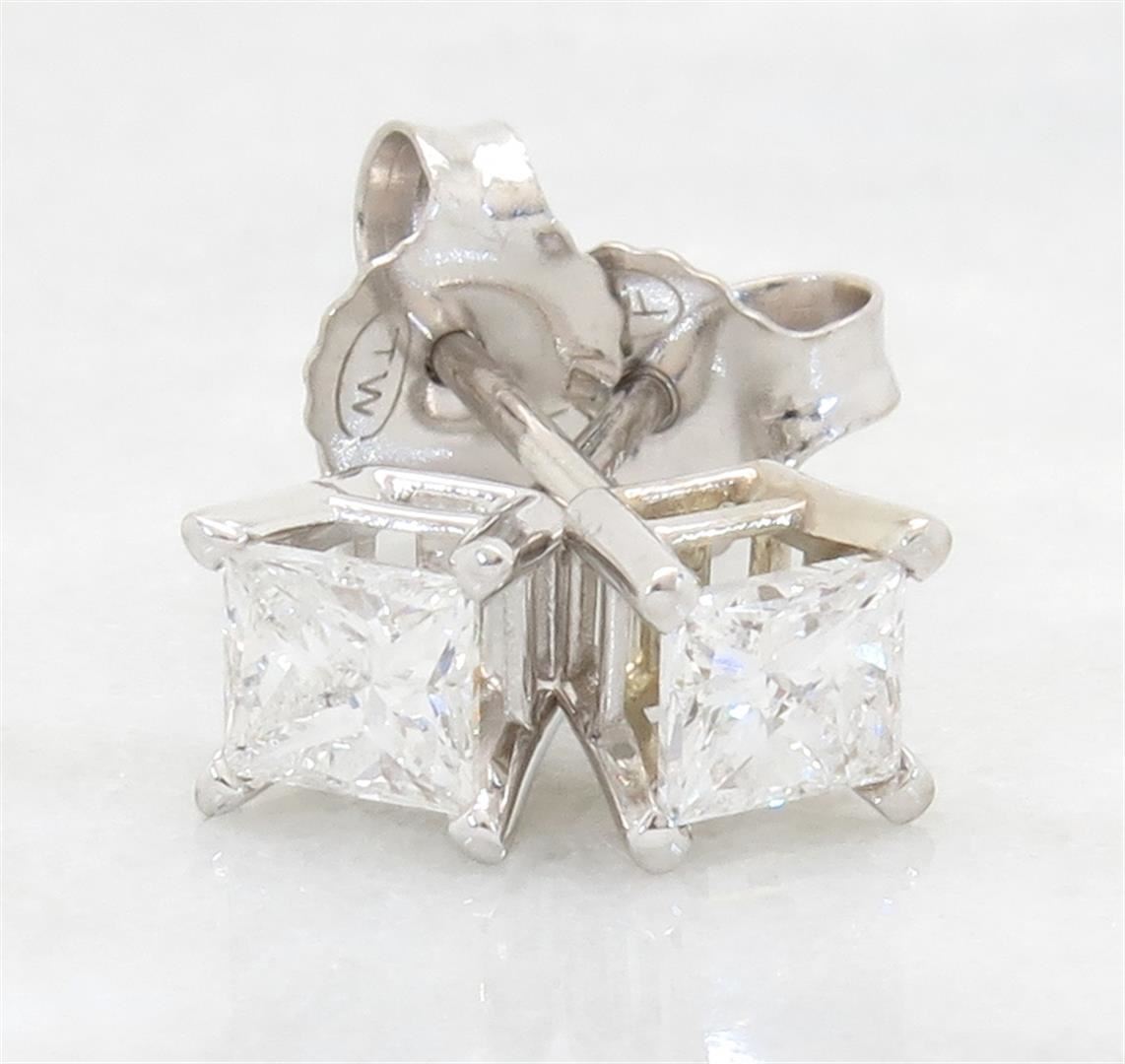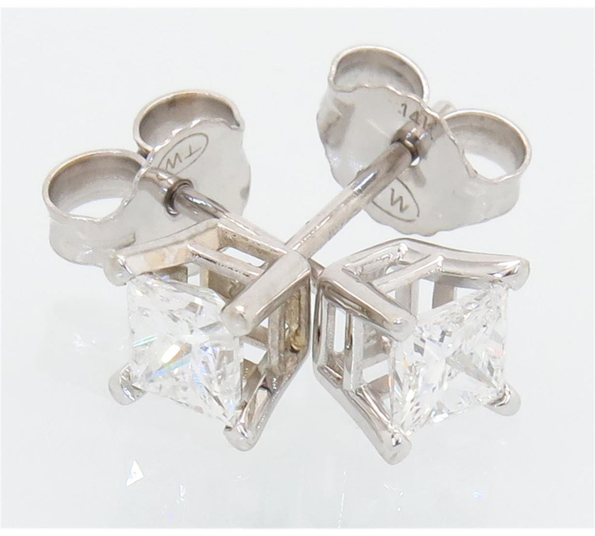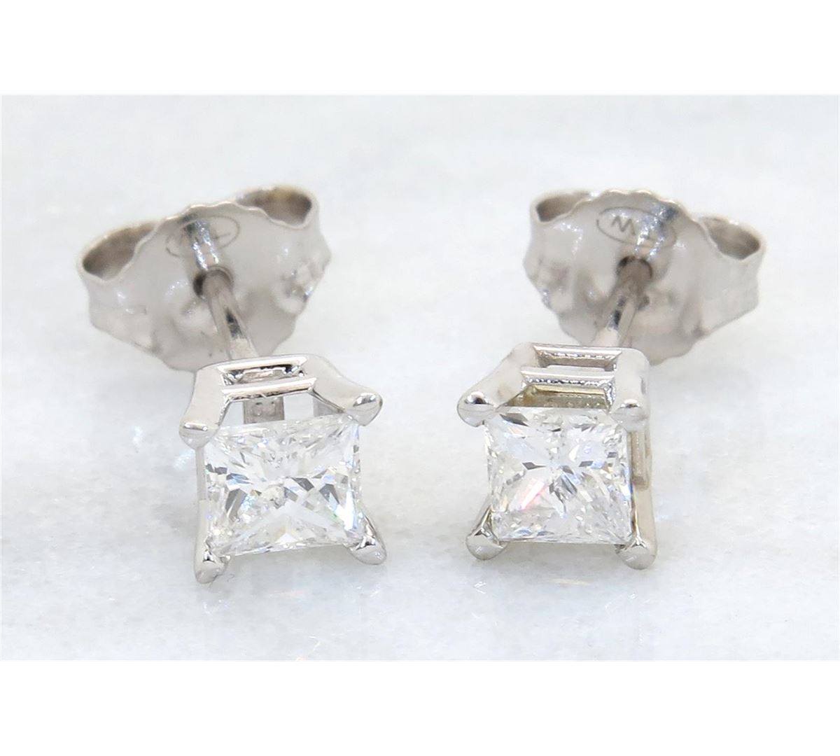 One pair of tested 14K white gold diamond earrings. Containing: Two Princess Cut Diamonds. Clarity: I, Color: G-H. Approximate total diamond weight: .50CTW. Diamonds are graded in the mounting, unless otherwise stated. Weight: 0.9 grams.